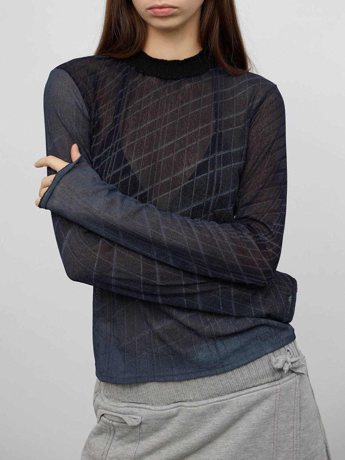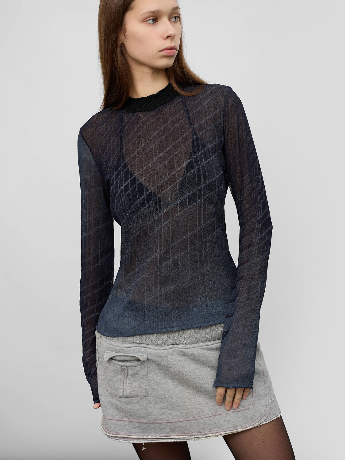 E-Play navy blue and grey sheer mesh longlseeve top with a rib knit collar.
