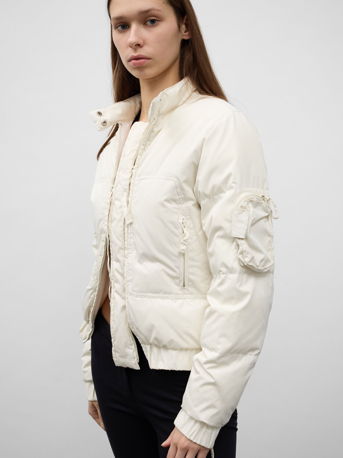 Extē cream lightly padded jacket with double zipper detail at the front, two waist pockets and small pocket at sleeve, zippers at the cuffs.
