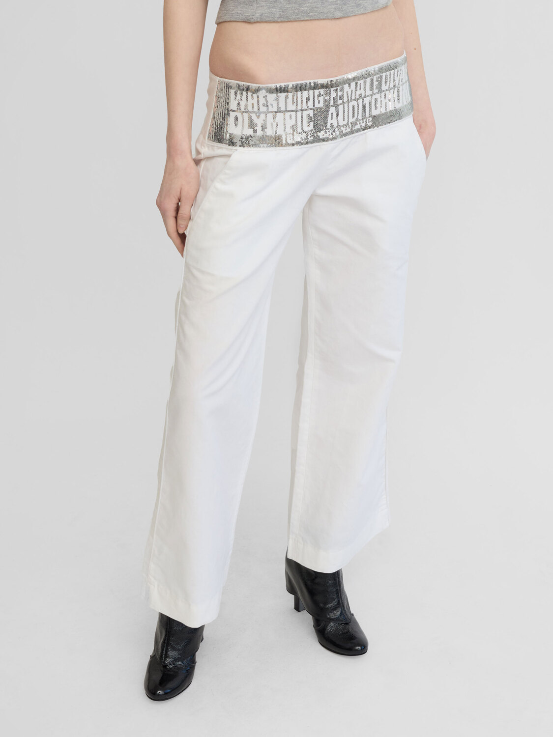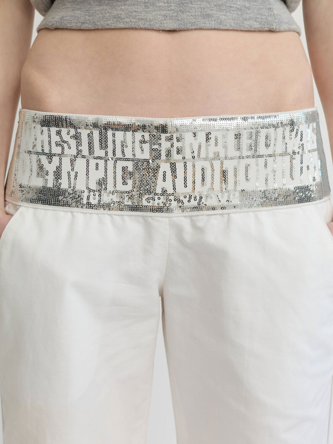 Extē white cotton and linen blend trousers. Silver sequin waist. Concealed zipper closure at the back.