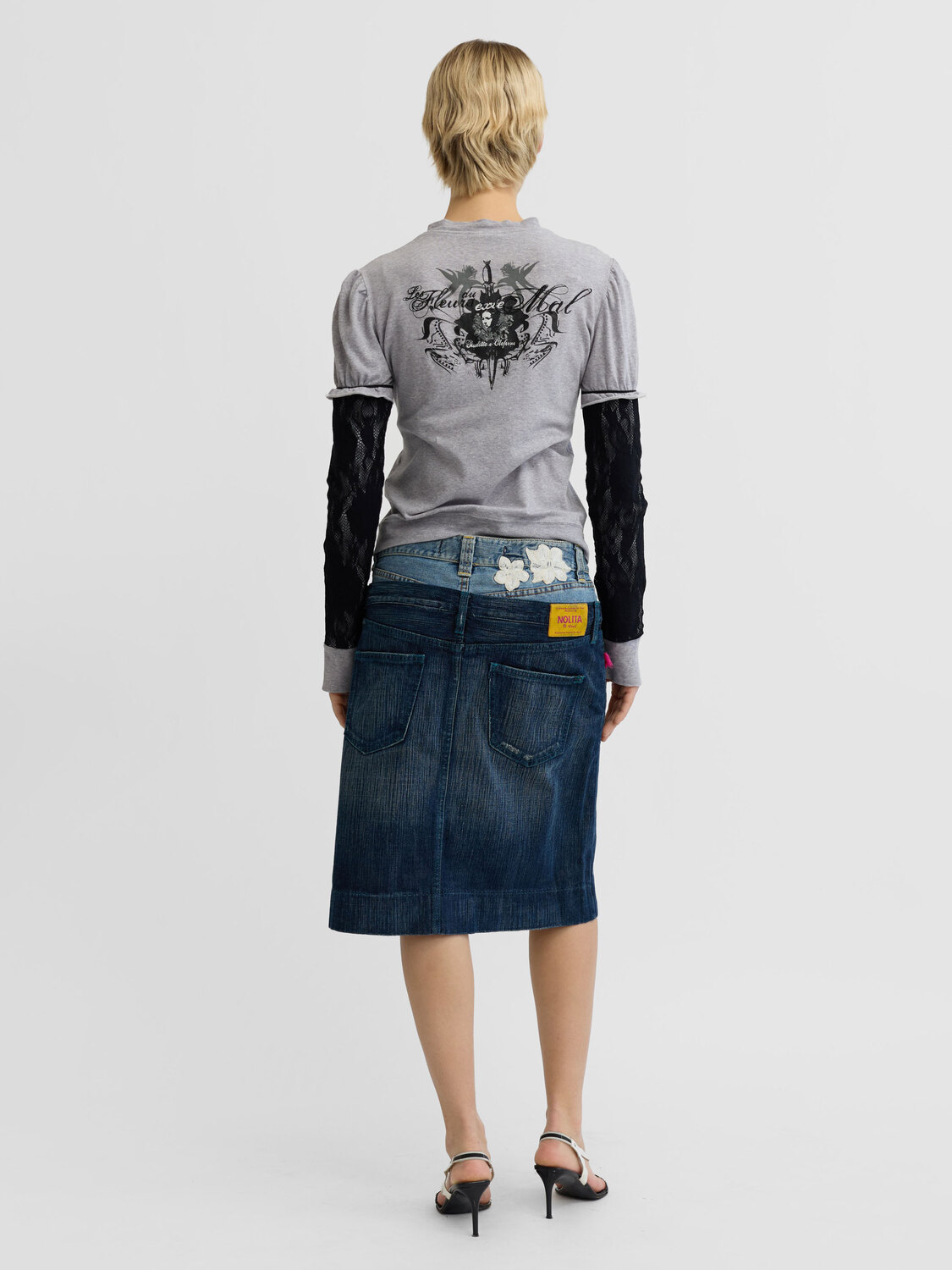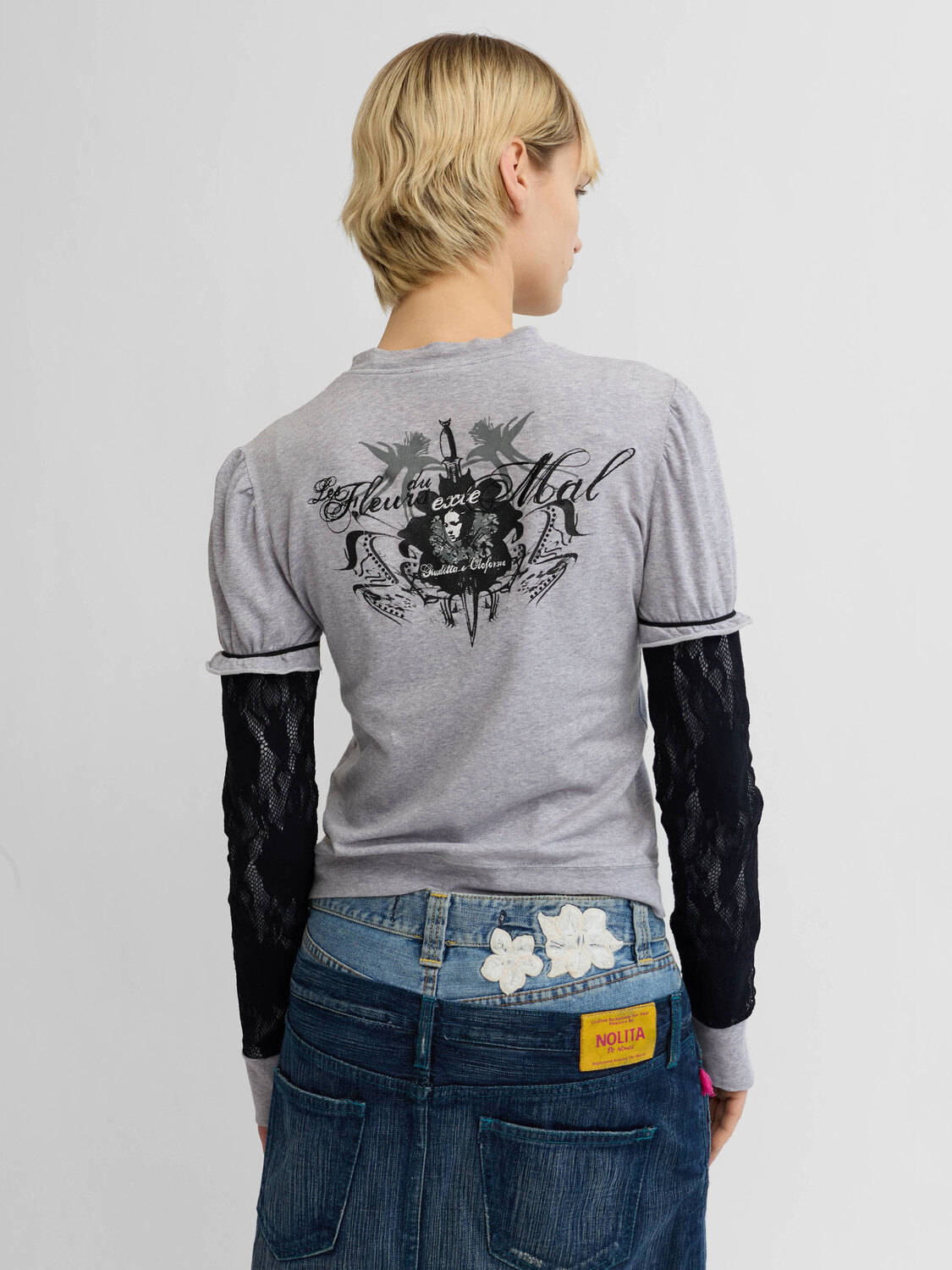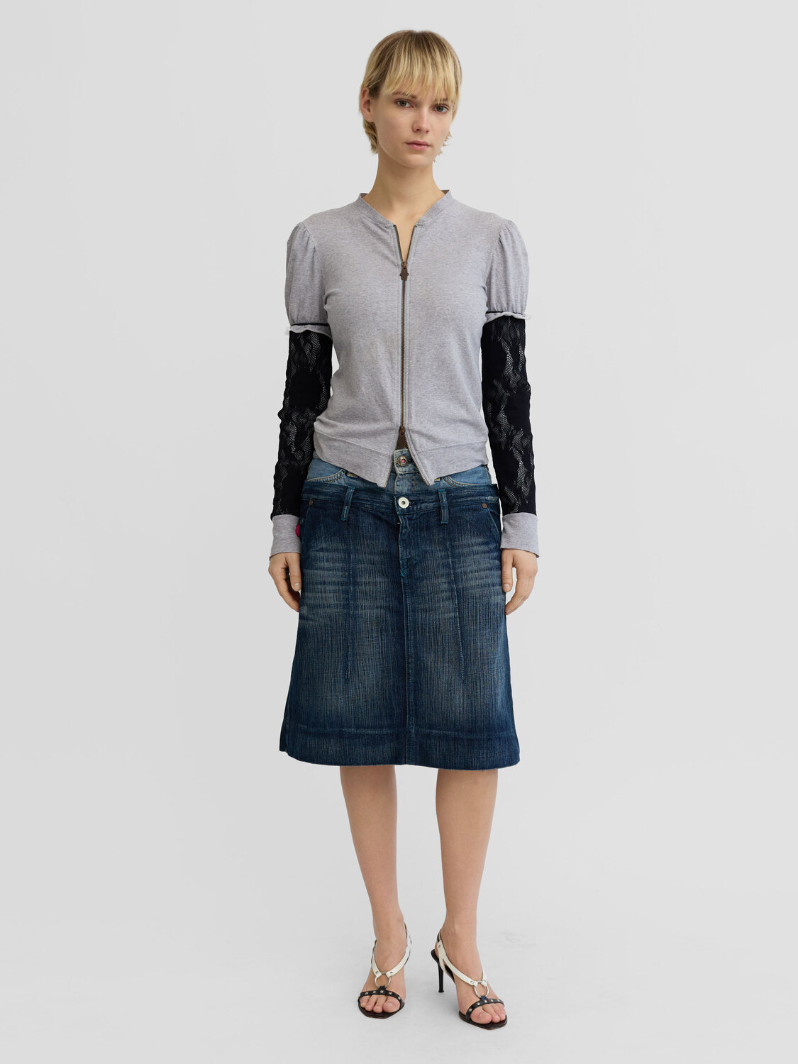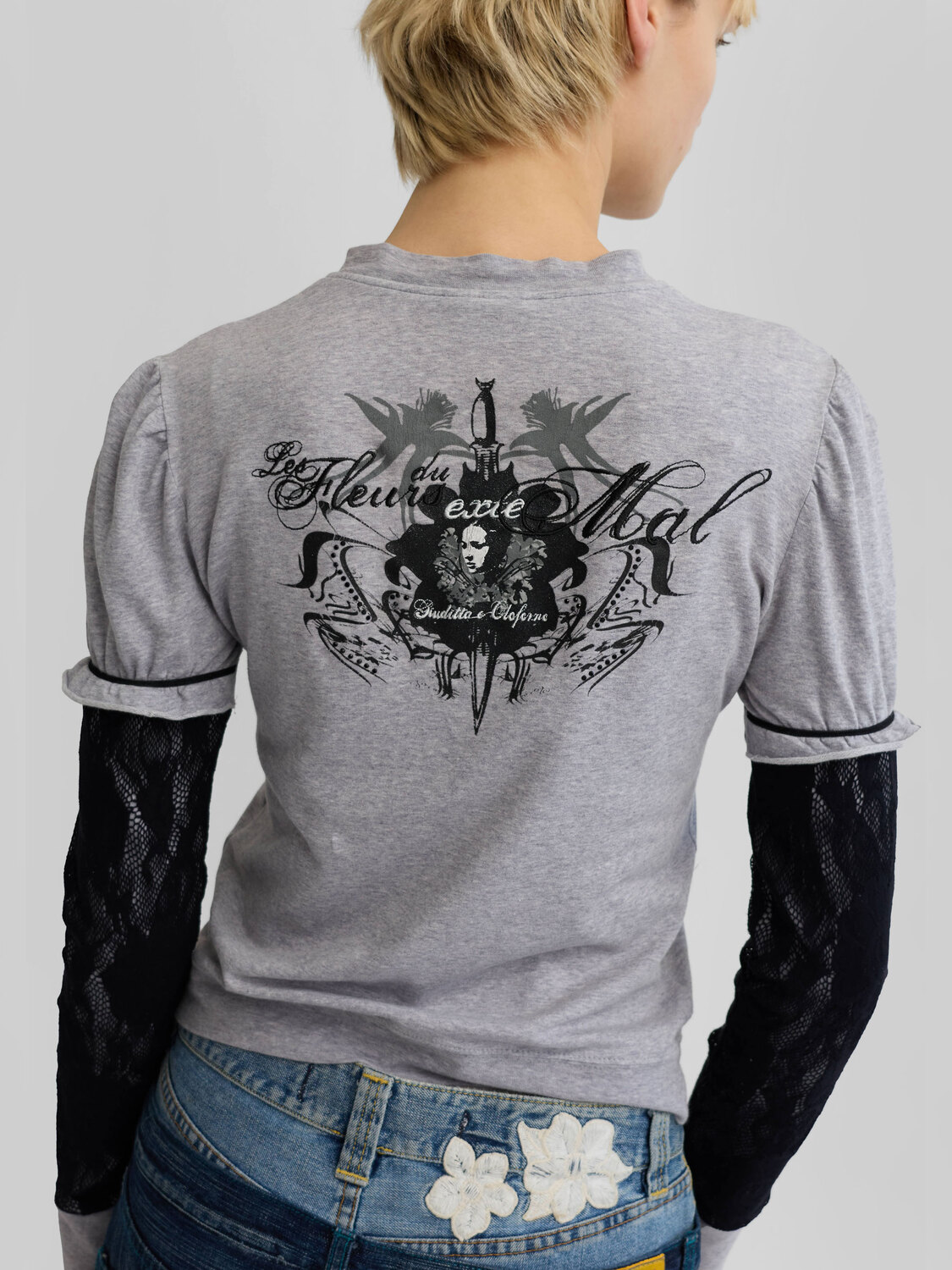 Extē grey cotton zip-up cardigan with black fishnet-style sleeves. Diamanté embellished graphic print at the back.