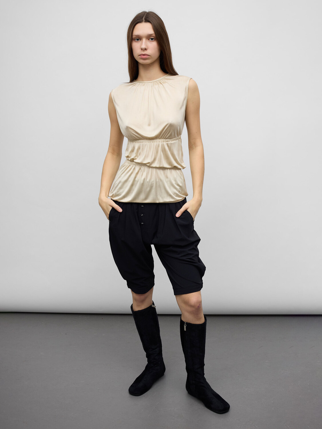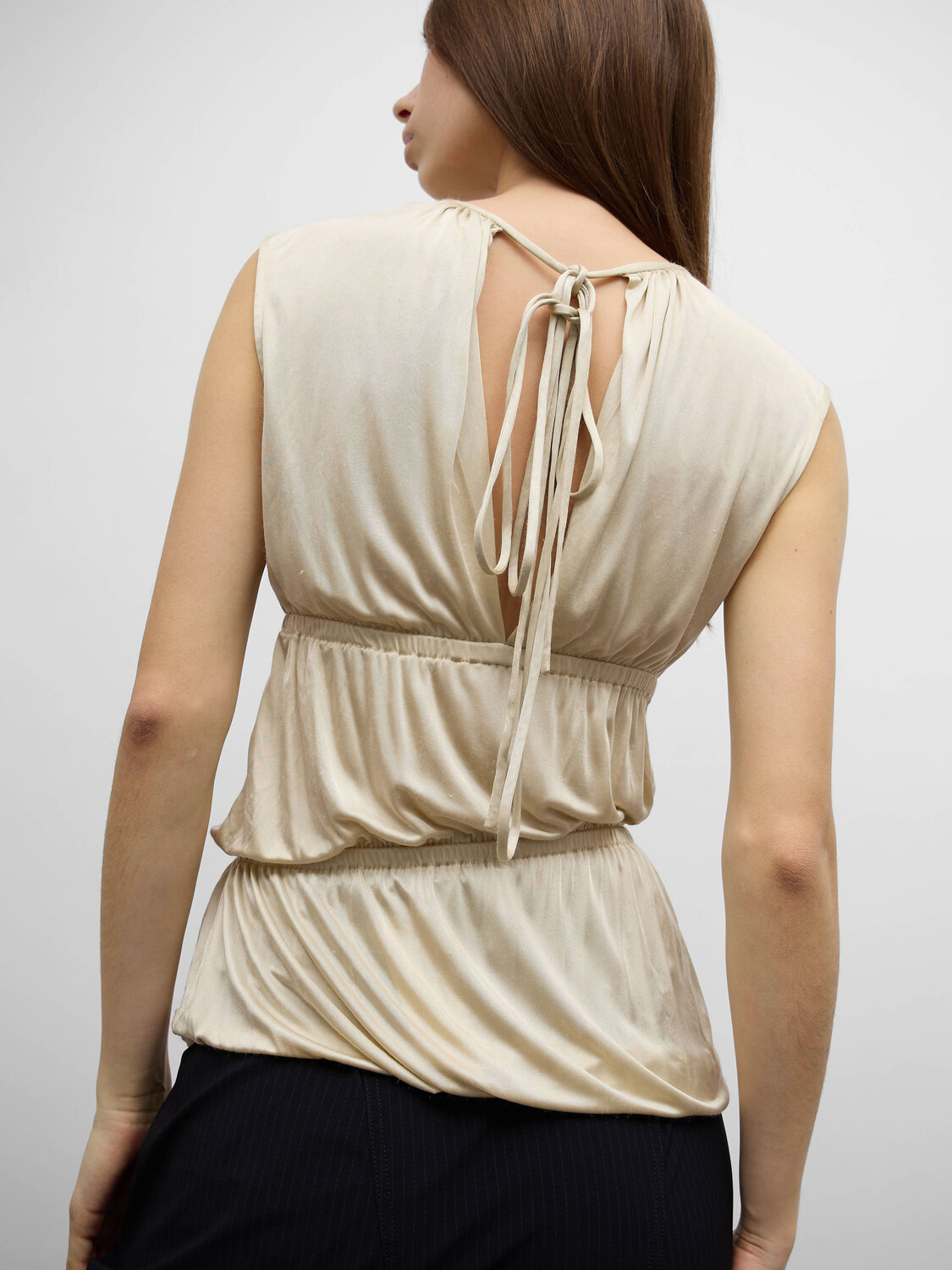 Faycal Amor shiny golden satin sleeveless gathered top with a slit at the back.