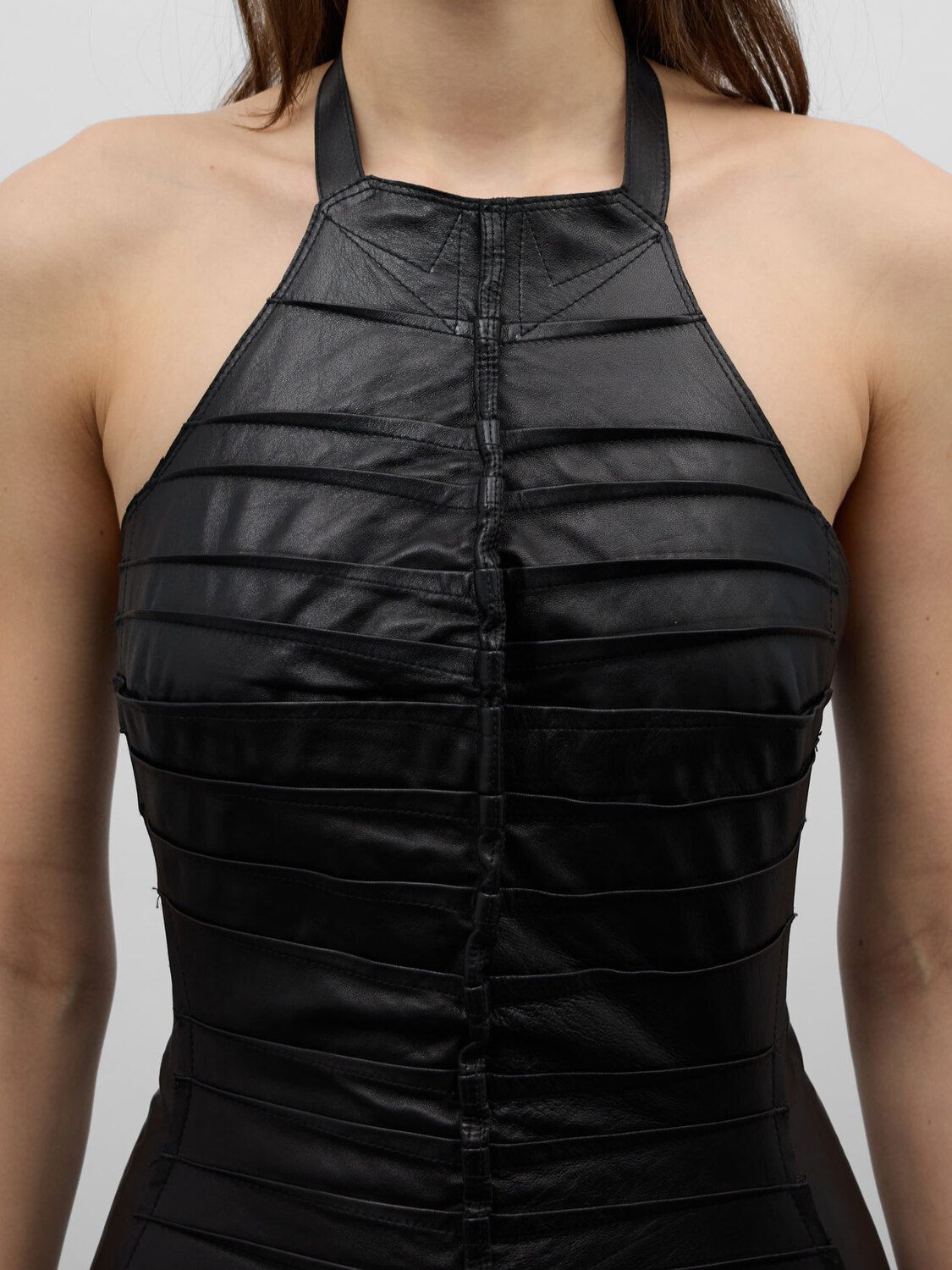 Faycal Amor (of Plein Sud) anatomical black leather halter mini dress featuring decorative ridges and seams all over and an asymmetrical hem. Adjustable collar strap. Concealed zipper closure on the side.