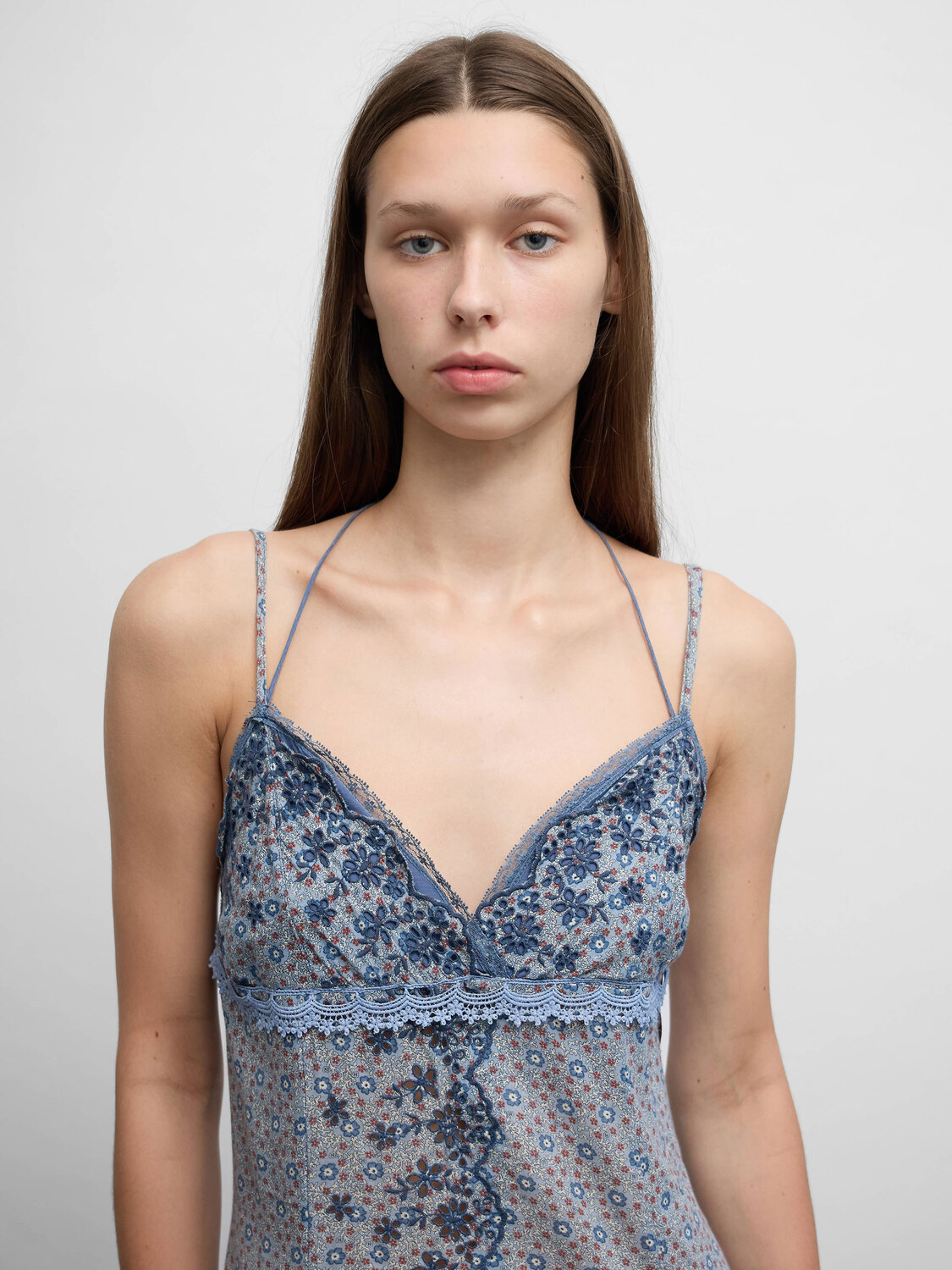Floral print sundress with lace trim, broderie anglaise details, and ruffles at the hem. Adjustable spaghetti straps, concealed zip closure at the back.