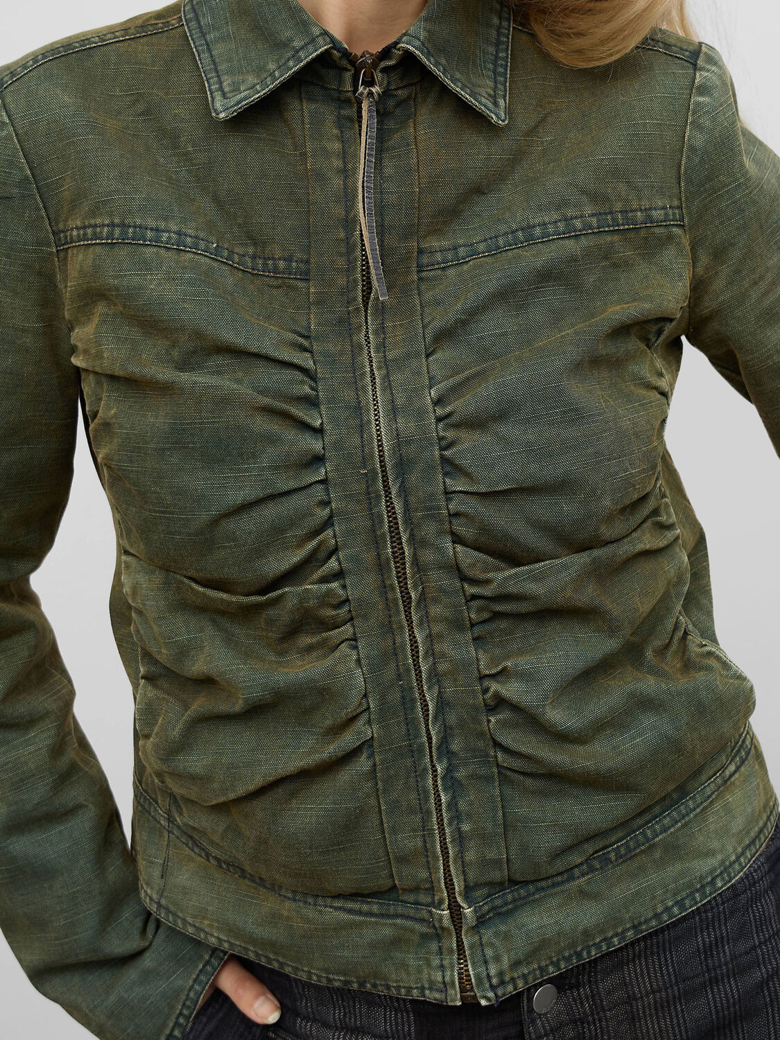 Fornarina green acid wash lightly padded denim jacket. Gathered details. Zipper closure. Adjustable cuffs.