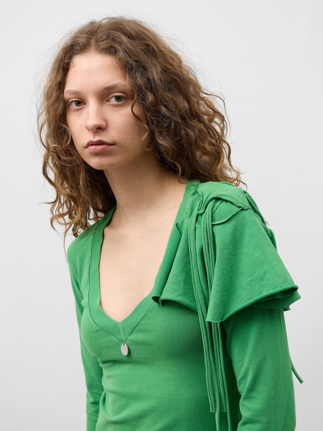 Fornarina green stretchy blouse with a fringed detail on the shoulder.
