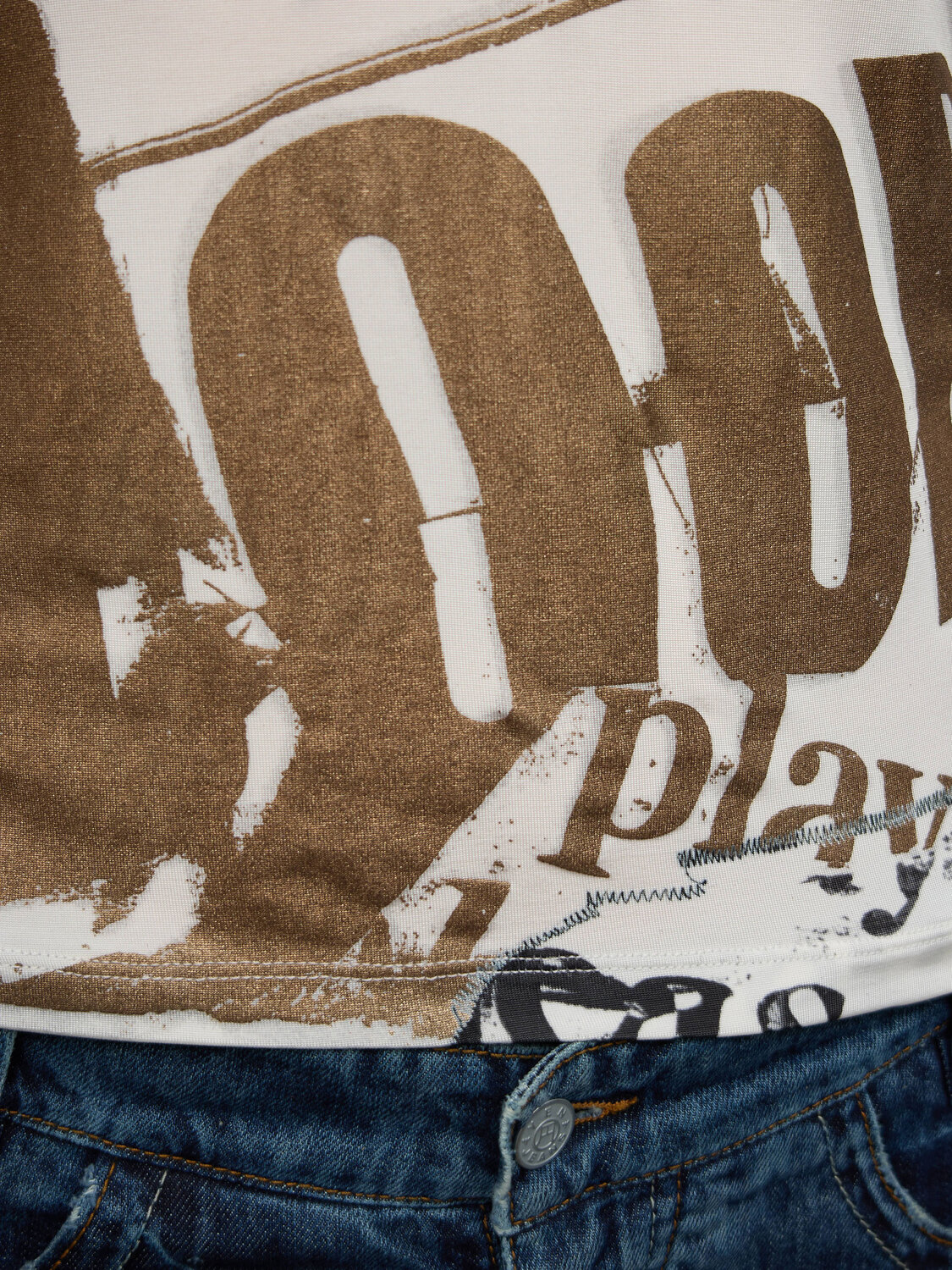 Galliano white stretchy viscose tank top with a black, red and bronze graphic print.