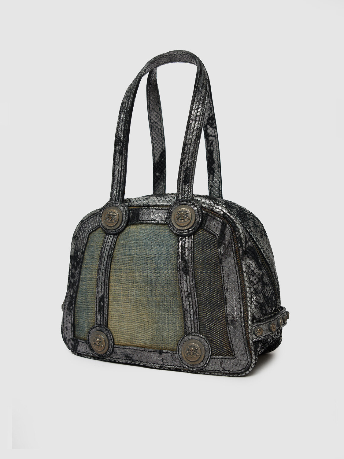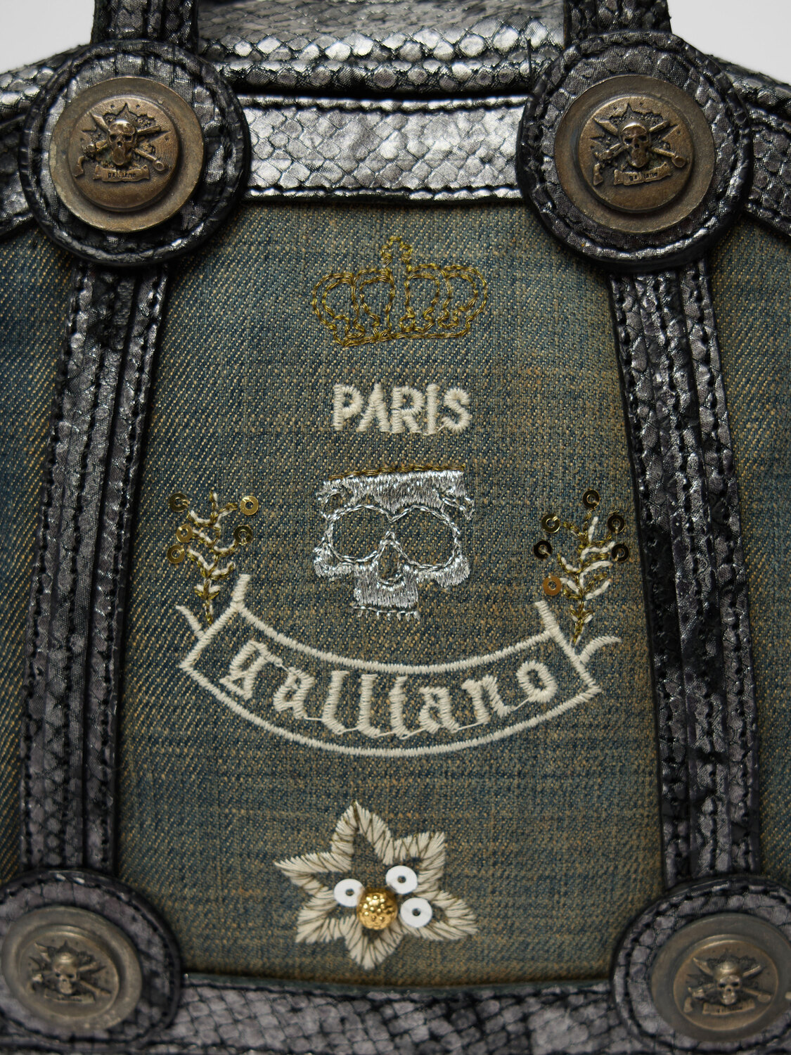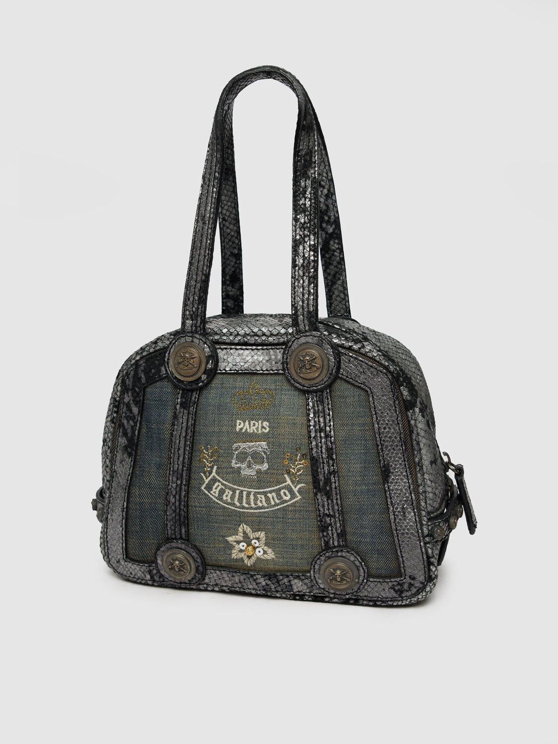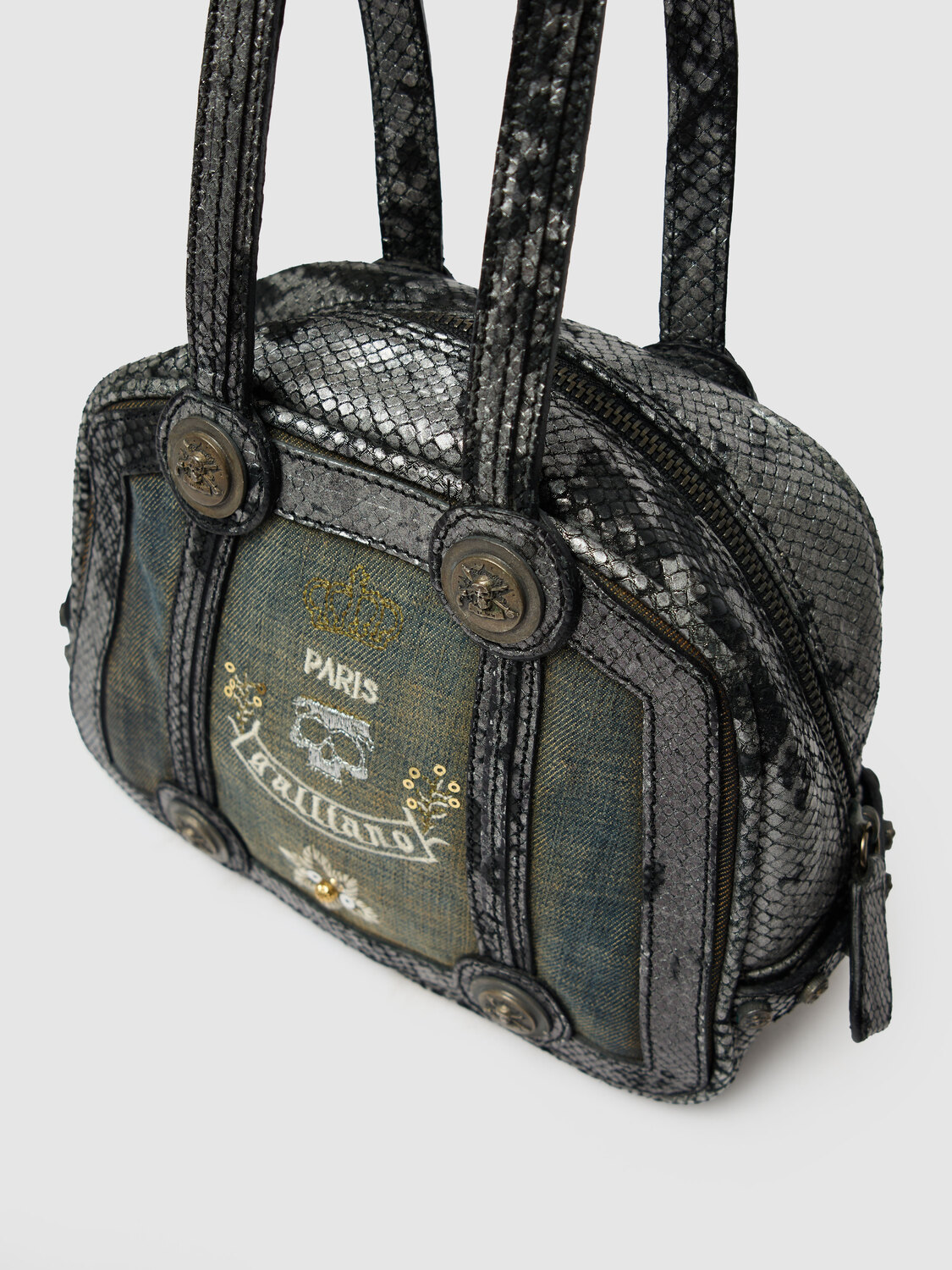 Galliano silver and black snake-print leather handbag with blue-wash denim panels, grey metal hardware, and embroidered detailing at the front. Internal zip pocket. Gazette print lining.