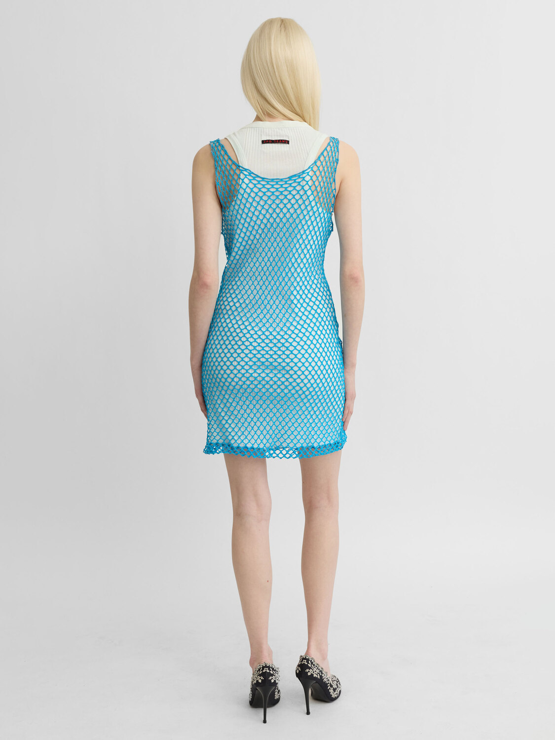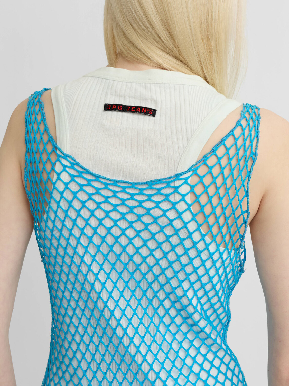 Jean Paul Gaultier (JPG Jean’s) white rib cotton and blue fishnet layered sleeveless dress.