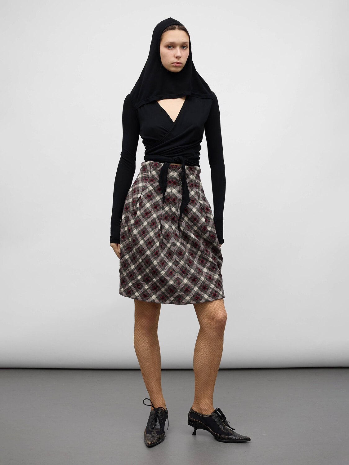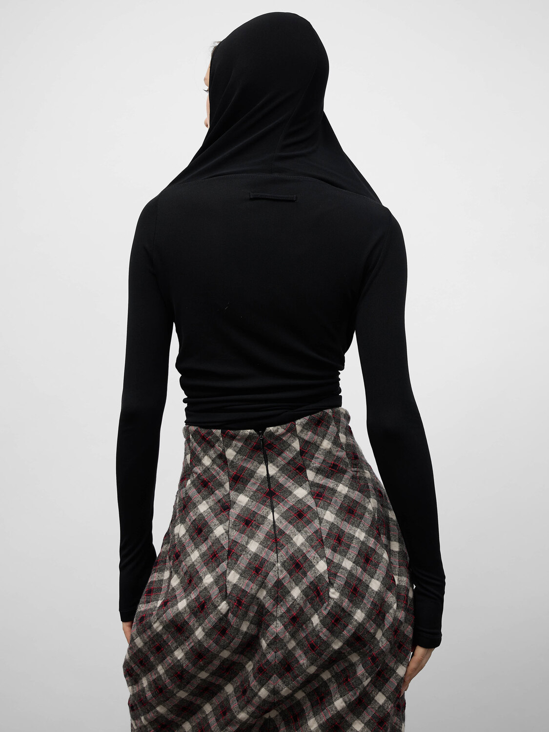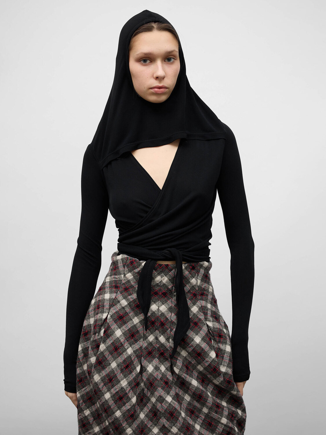 Jean Paul Gaultier black rayon wrap-around long-sleeve cardigan with a hood.