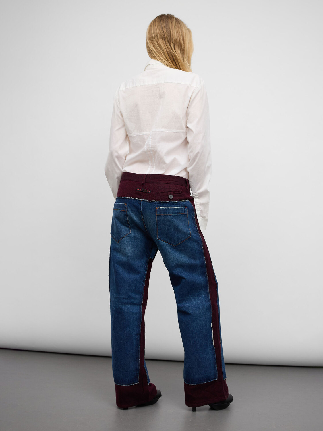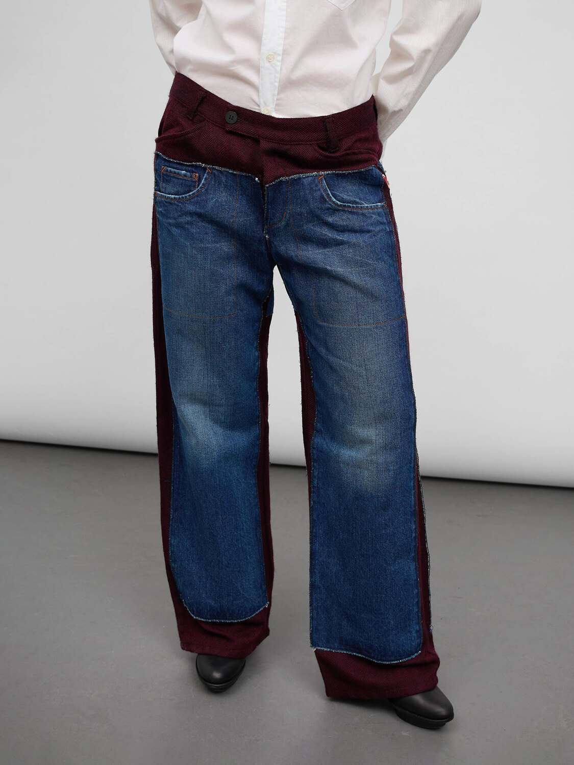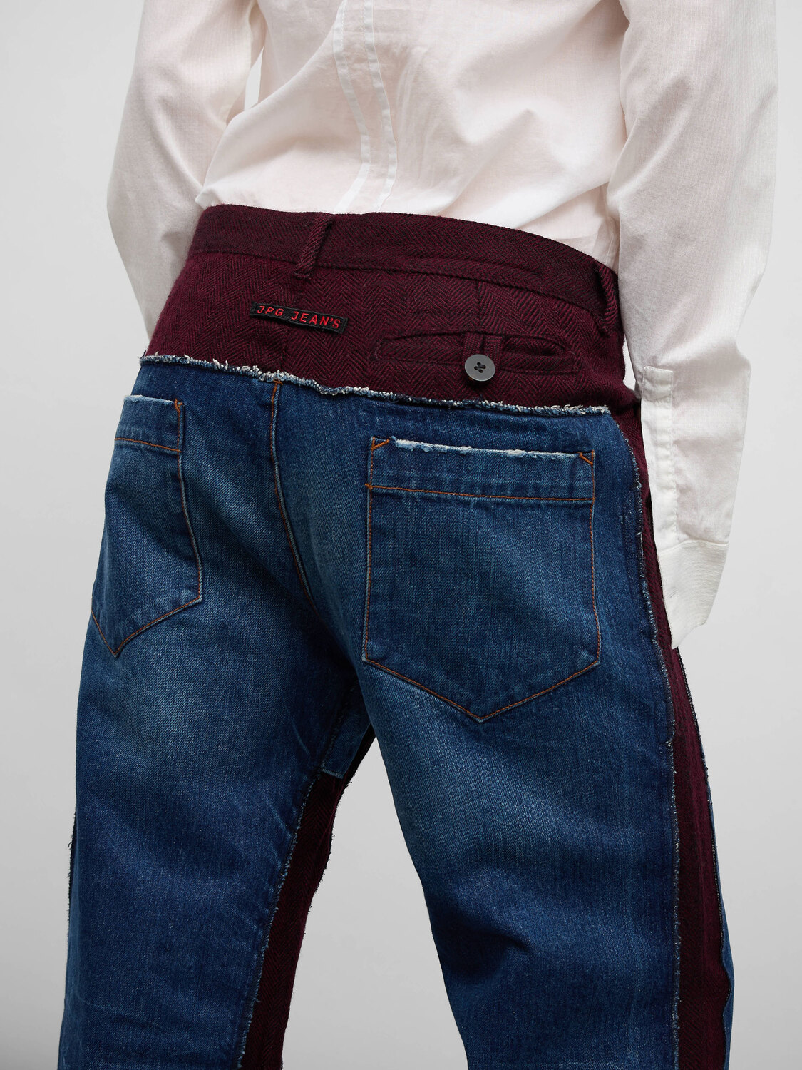 Jean-Paul Gaultier (JPG Jean’s line) burgundy tweed and blue denim deconstructed trousers. Denim sections with light wash effect and raw finish. Multiple front and rear pockets.