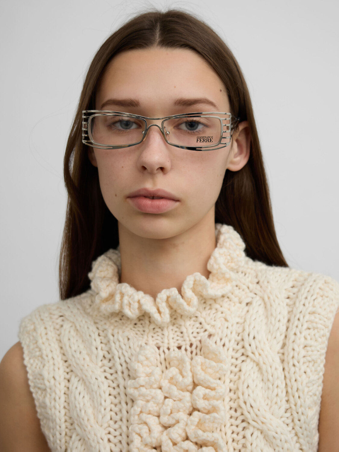 Gianfranco Ferre rectangular glasses encased in a silver-tone metal “cutout” frame. Logo on the temples.