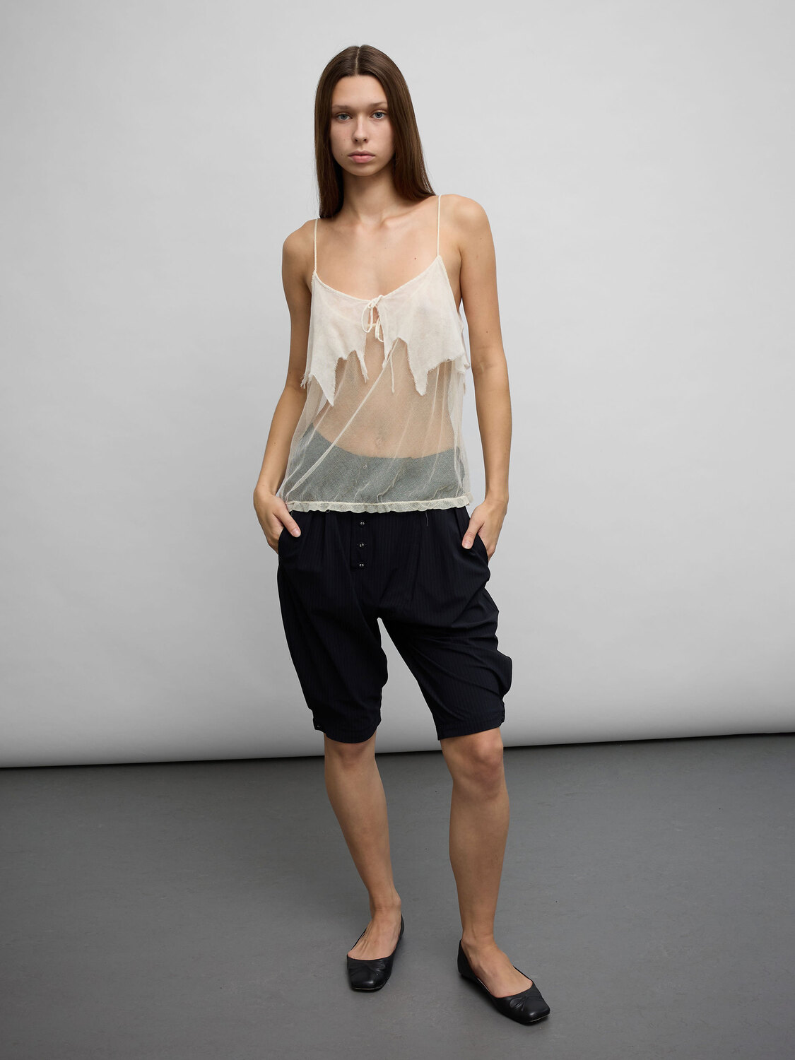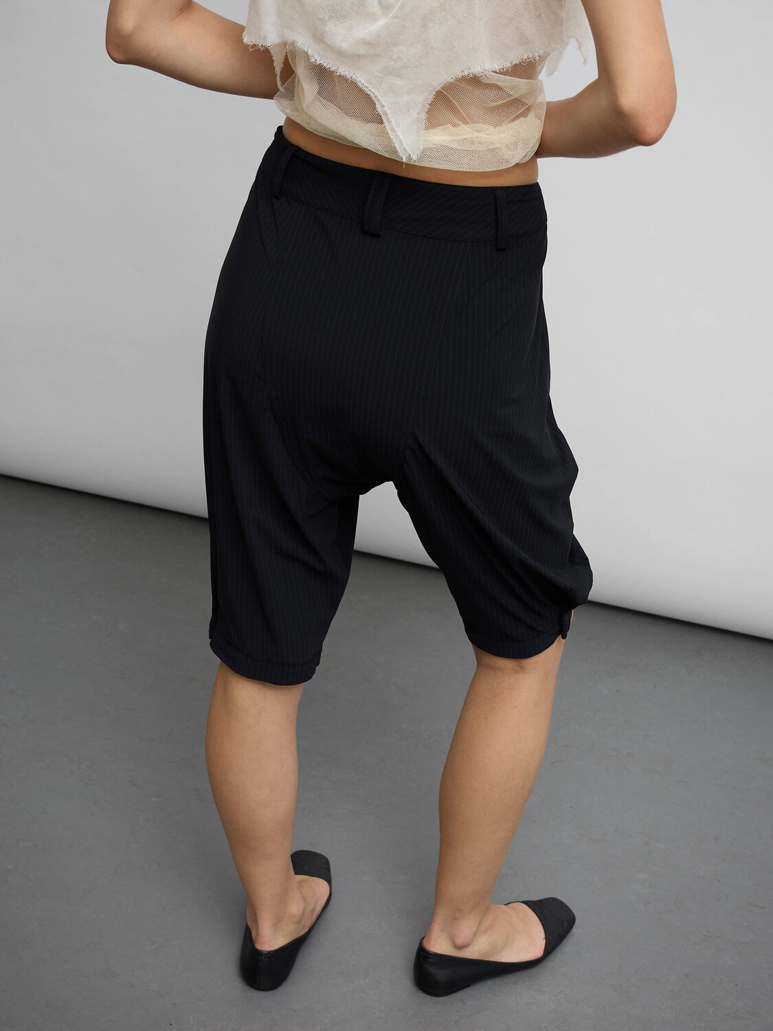 Marithé+François Girbaud blueish black pinstripe breeches with pleated details. Button closure.