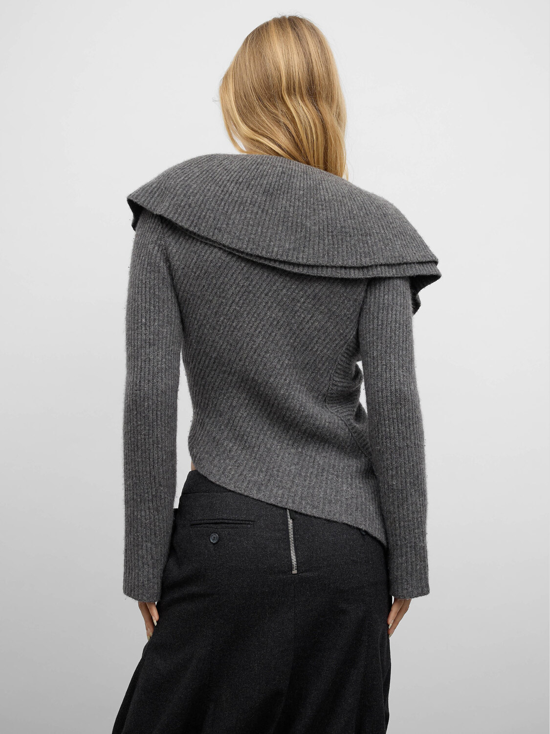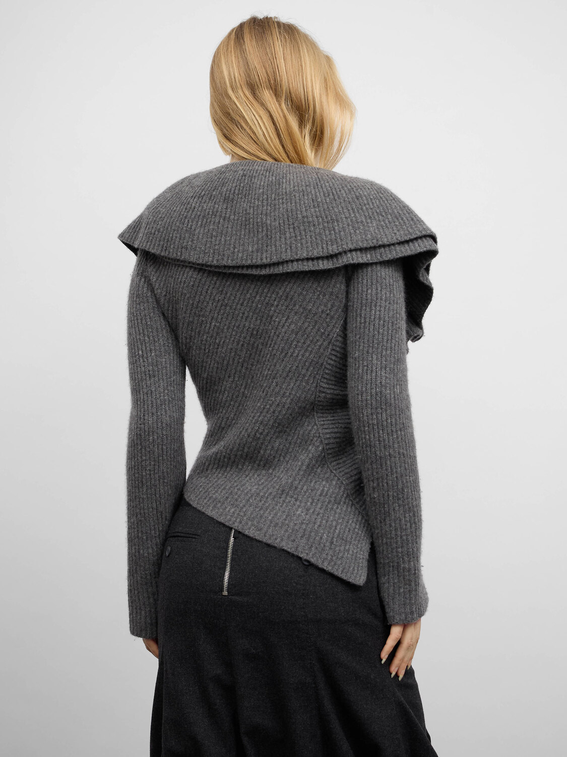 Grey rib knit wool draped effect cardigan featuring snap button closure, large collar and asymmetrical hem.