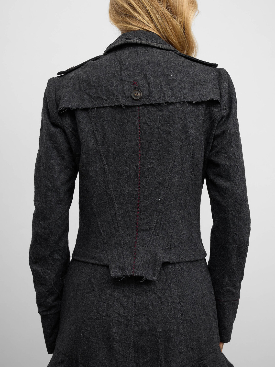 Grey wrinkle effect coat with a corset-style detail, burgundy contrast stitching and shoulder straps.