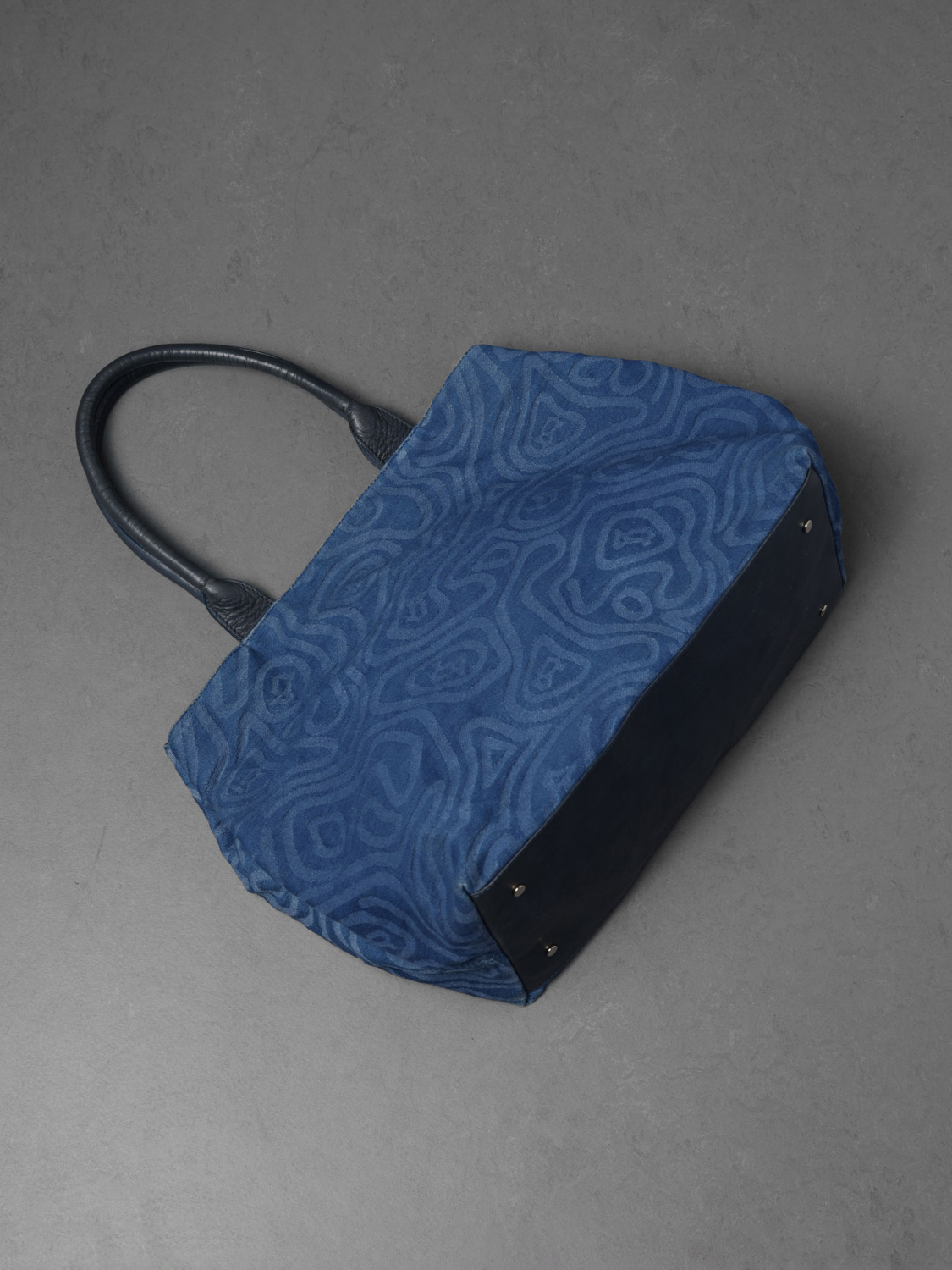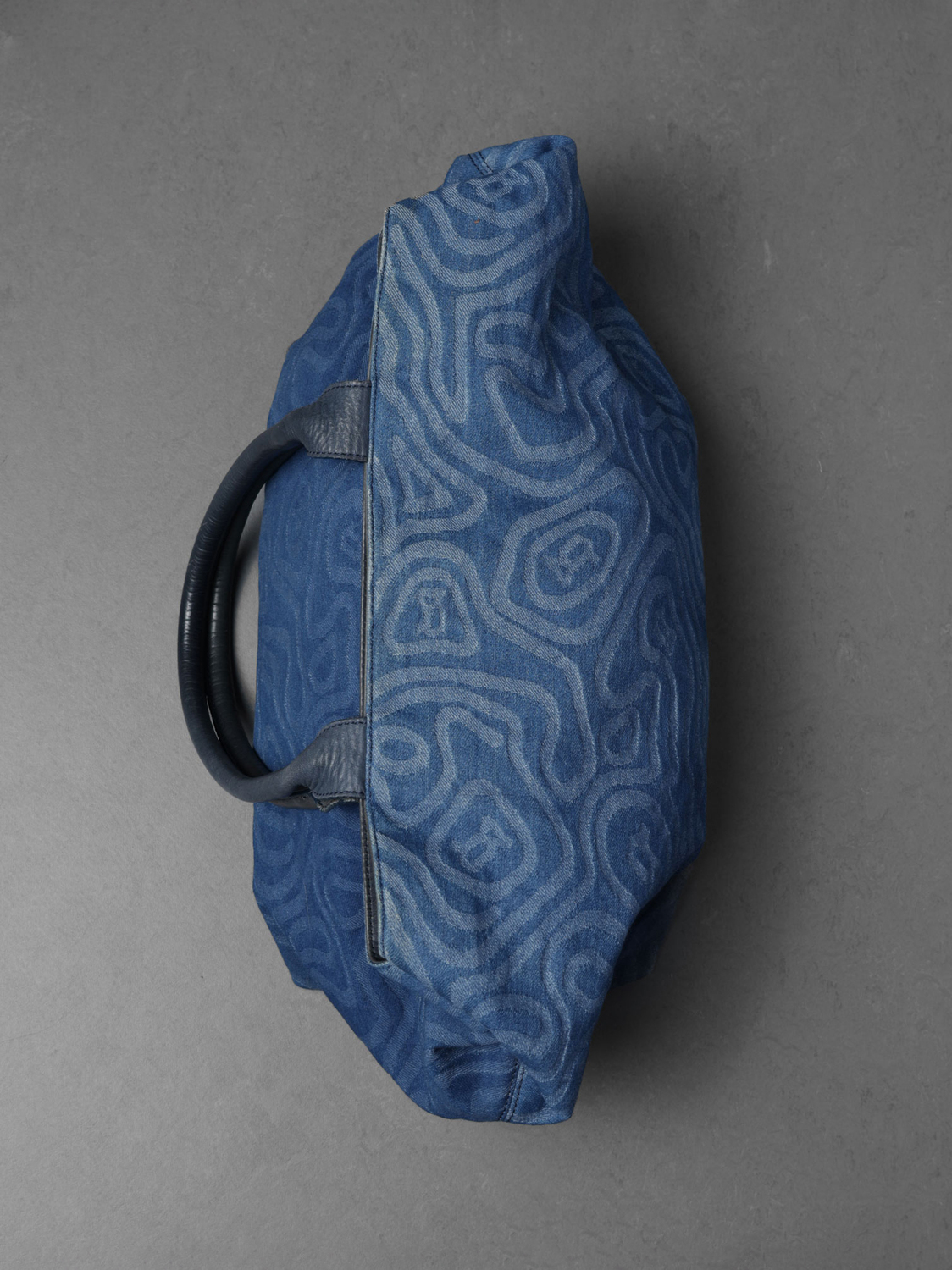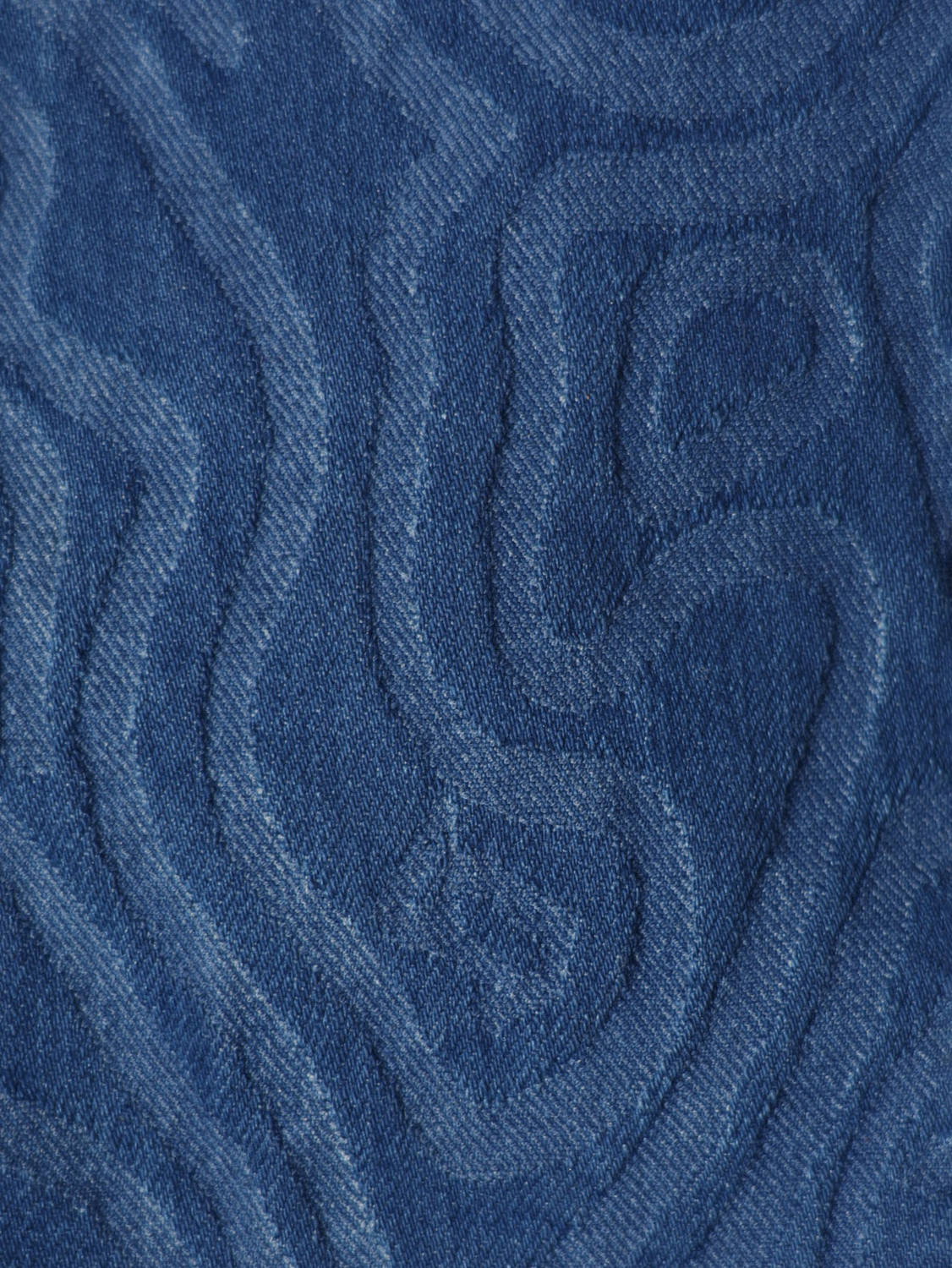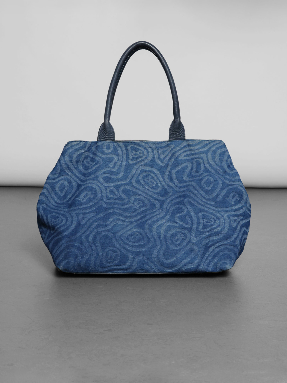 John Galliano blue denim jacquard handbag. Abstract logo print. Leather handles and reinforcements. Extendable at the top.Peach gazette print lining. Magnetic snap button closure.