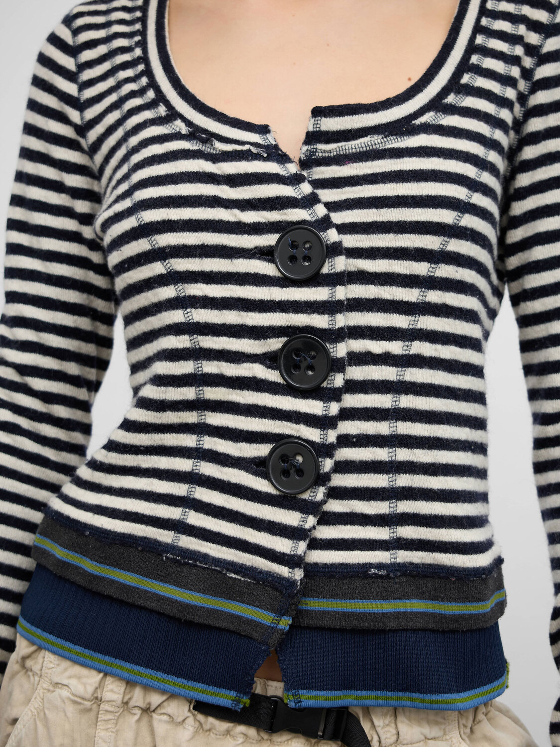 Black and white knitted striped button-up cardigan with multicoloured trims.