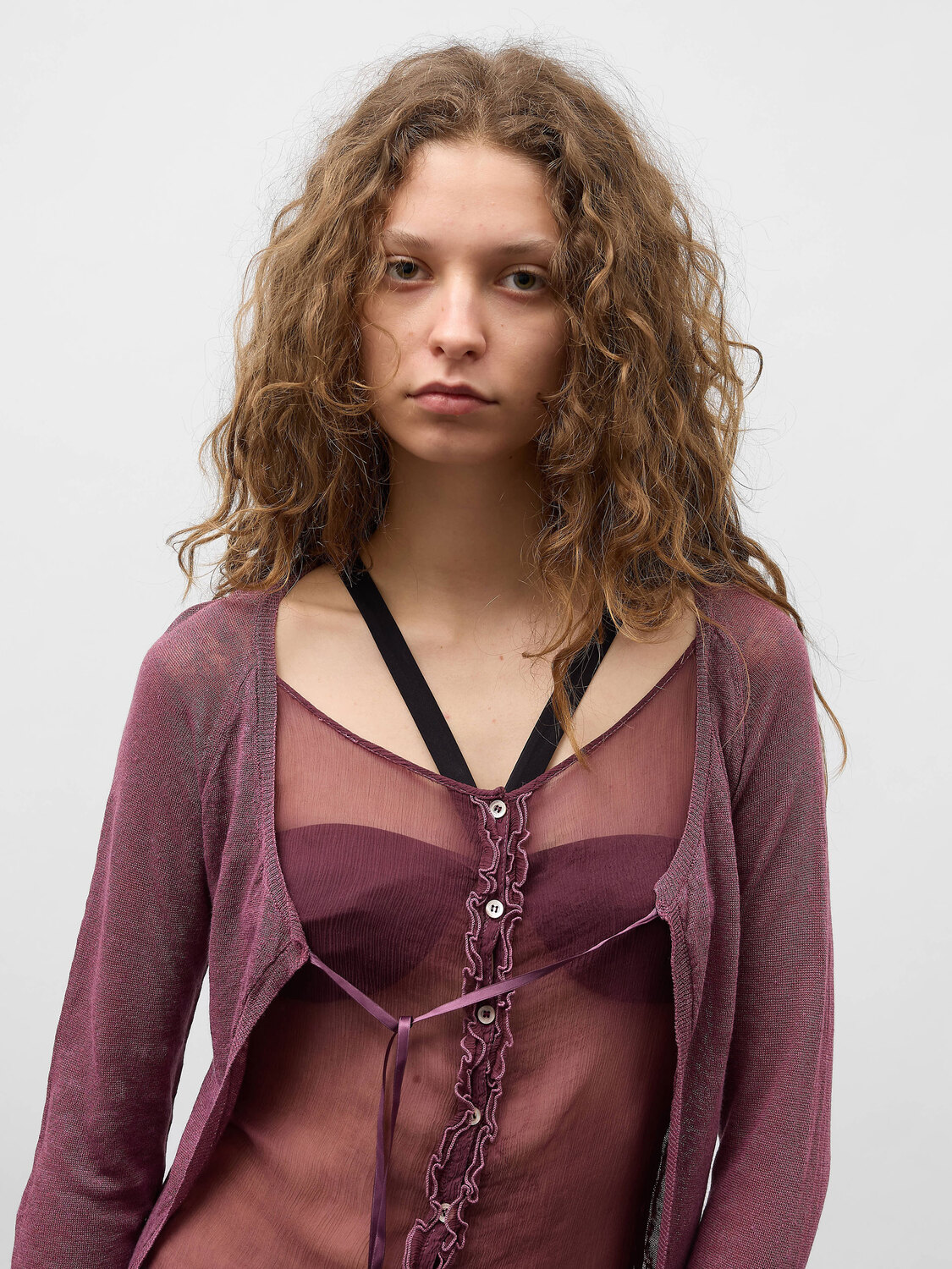 Plum linen knitted button-up cardigan with a silk chiffon layer.