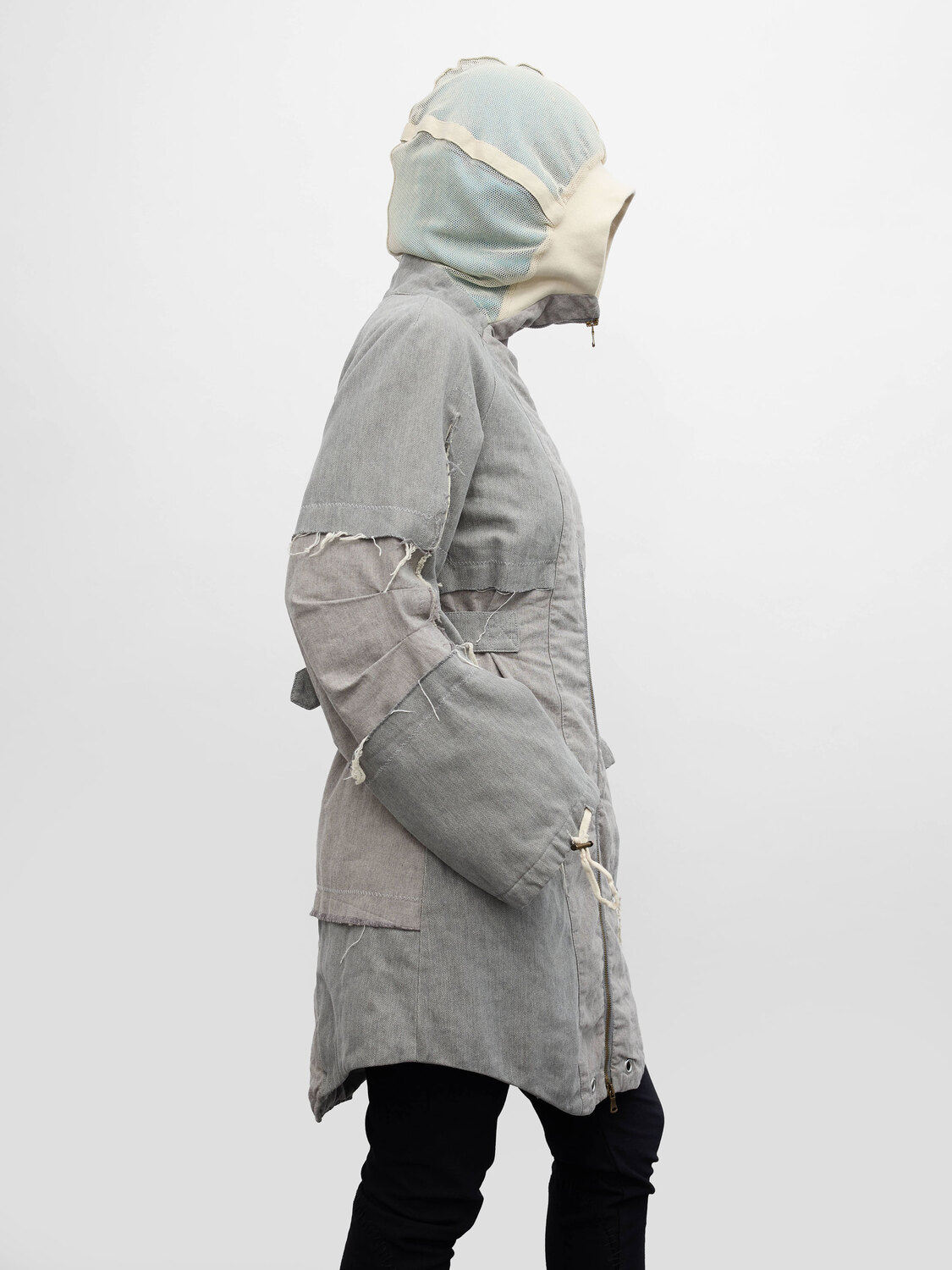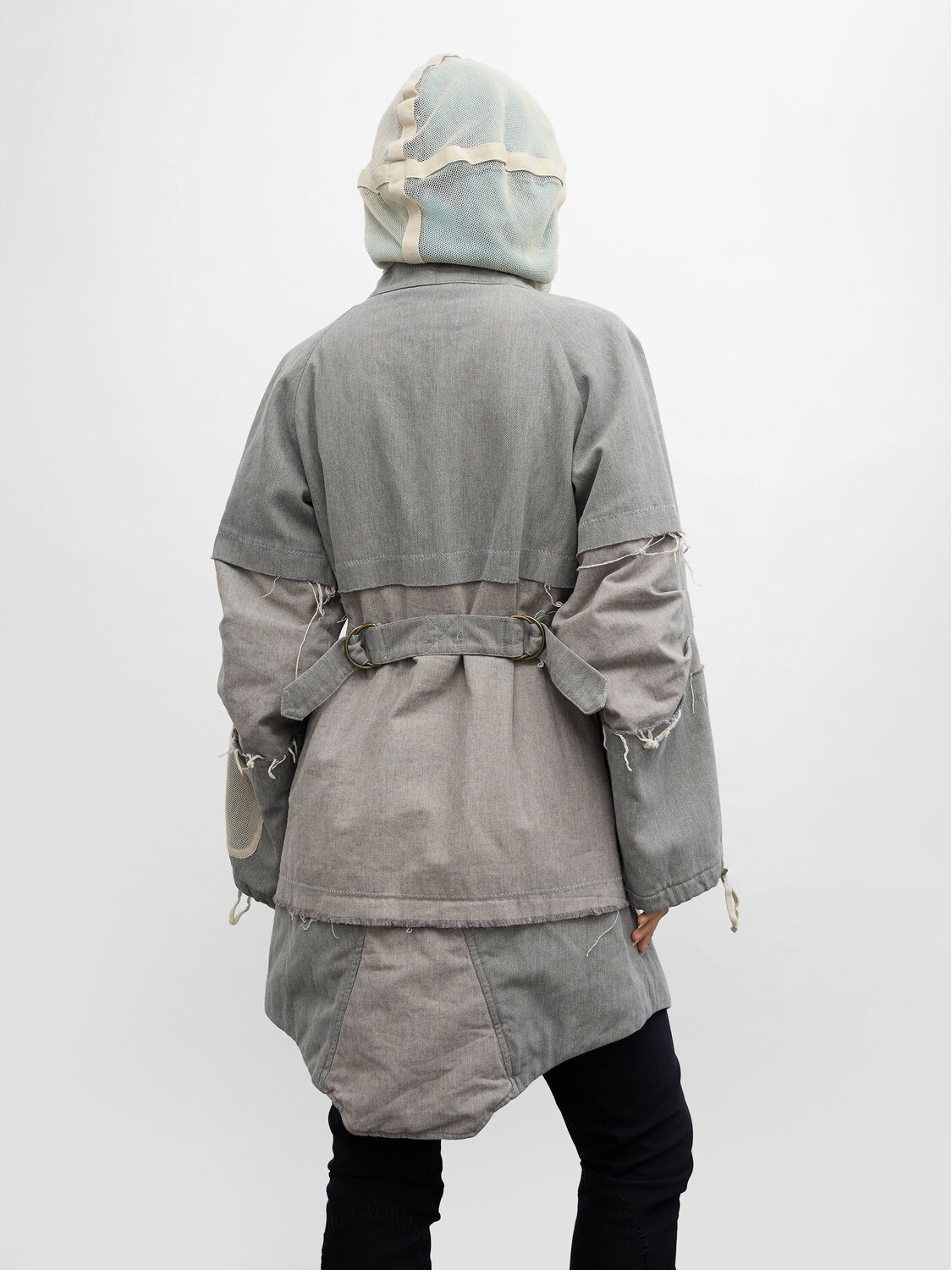 Michiko Koshino grey canvas patchwork hooded coat. Adjustable waist. Zipper closure.