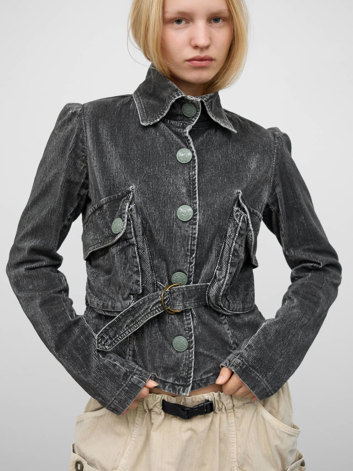 Michiko Koshino (Yen Jeans) dark grey acid wash corduroy jacket with large chest pockets, an integrated belt and snap button closure.