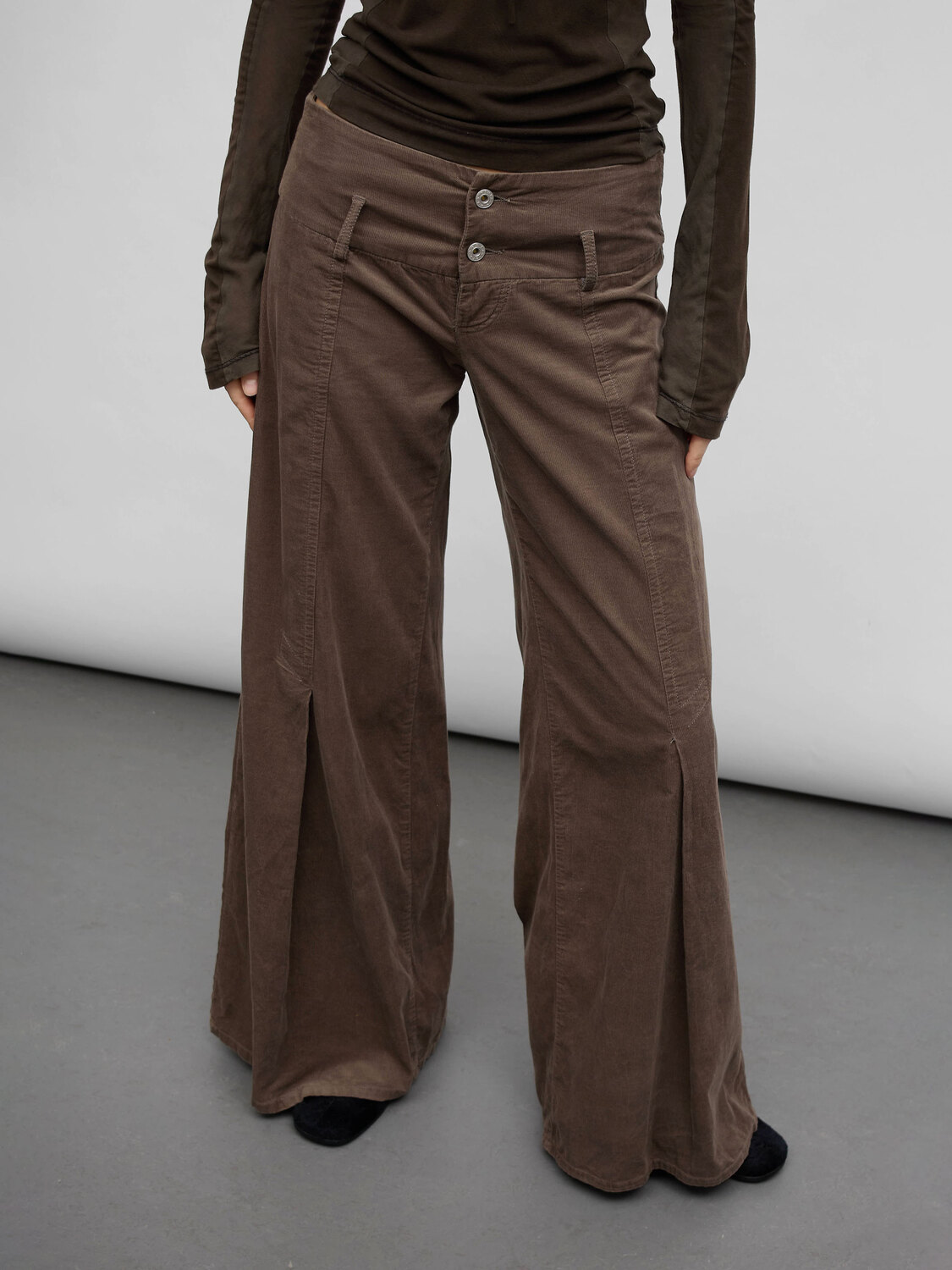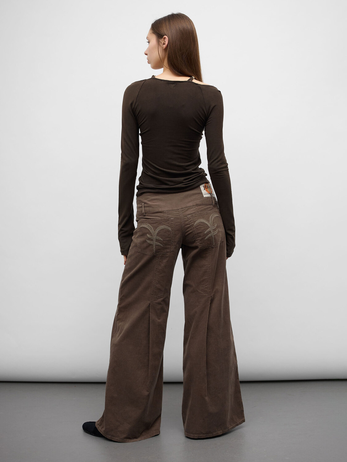 Michiko Koshino (Yen Jeans) brown corduroy wide leg trousers with logo embroidery on rear pockets.