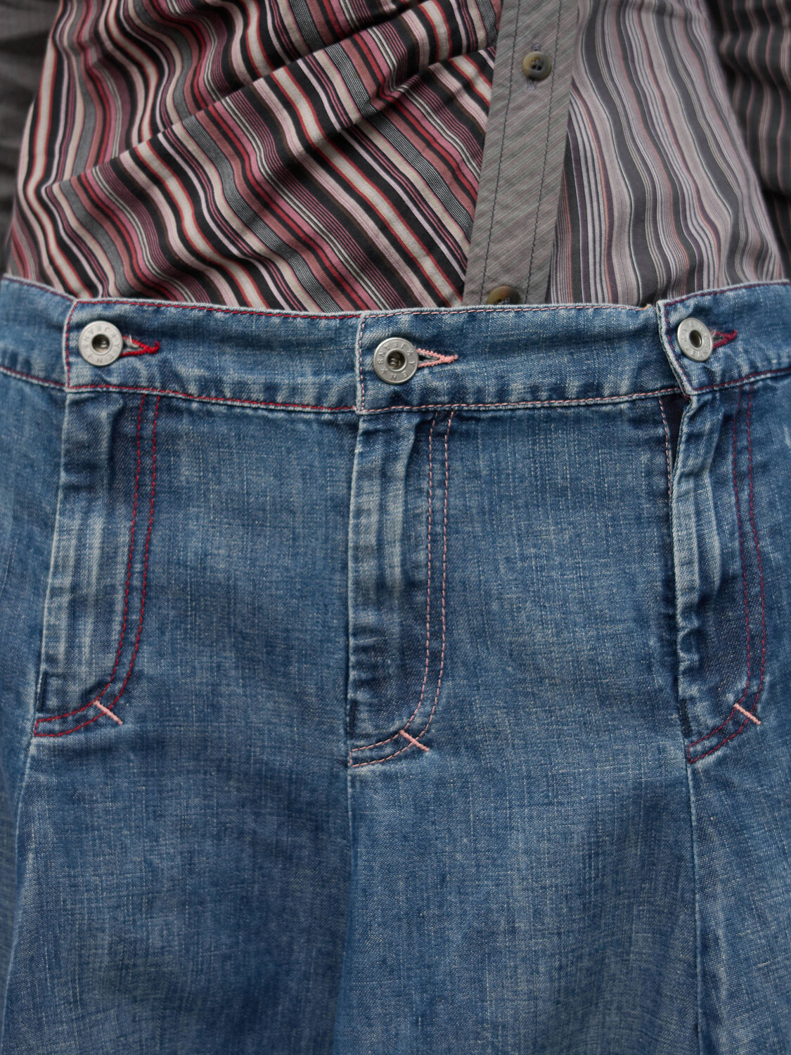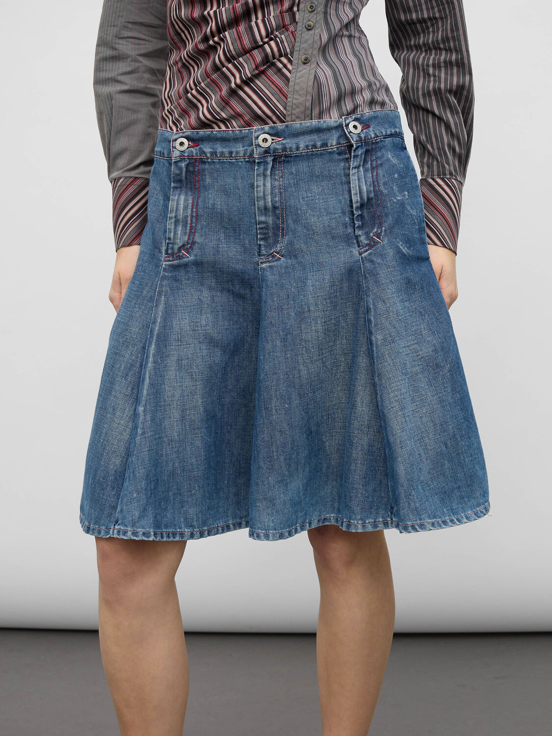 Michiko Koshino blue cotton and linen blend deconstructed midi skirt with side seam hand pockets.