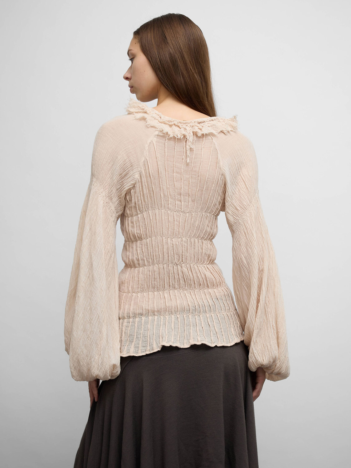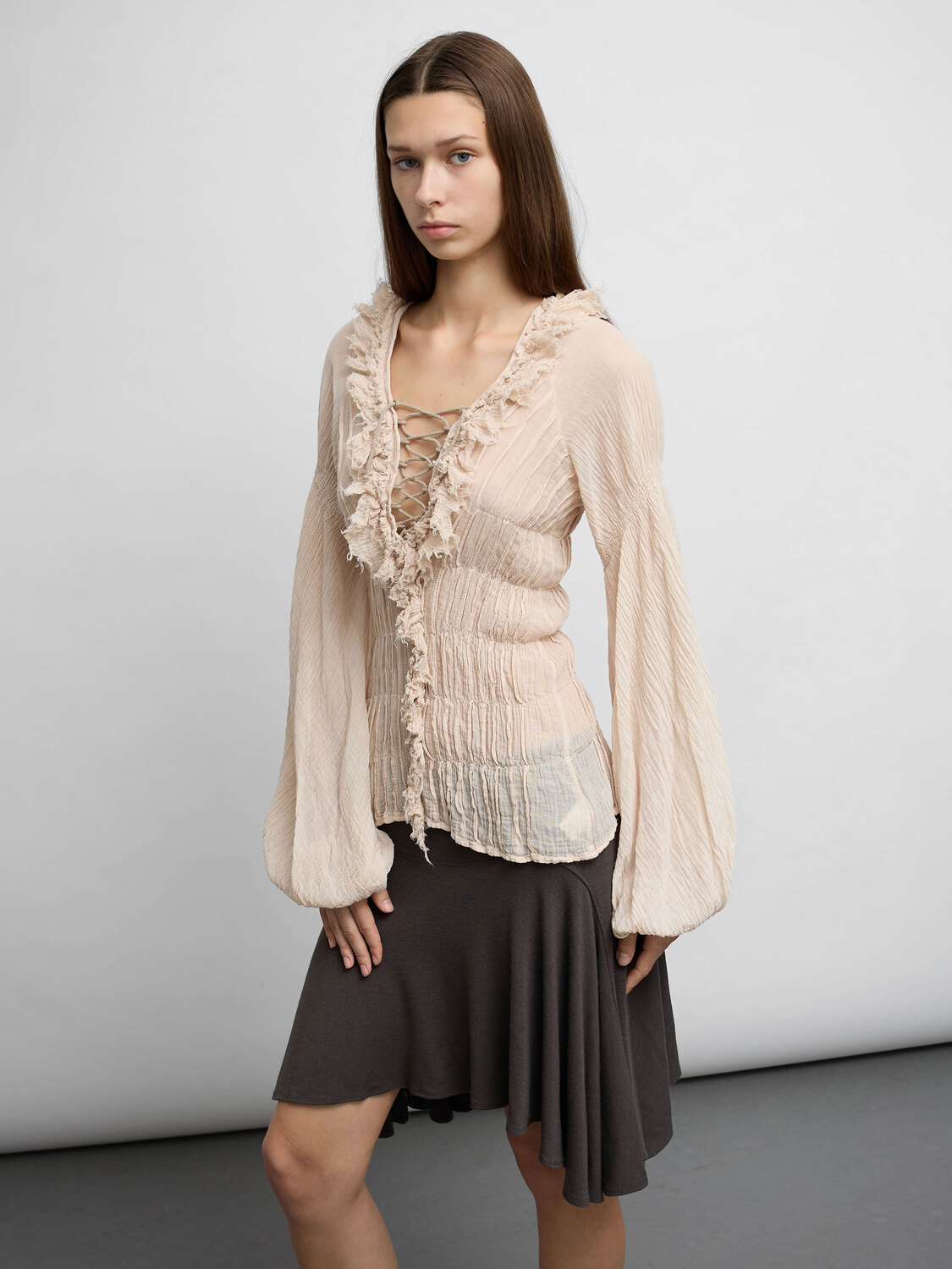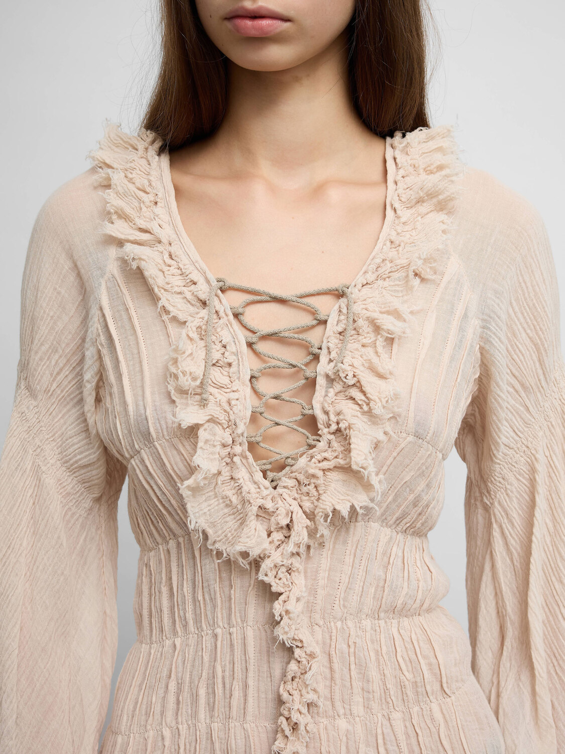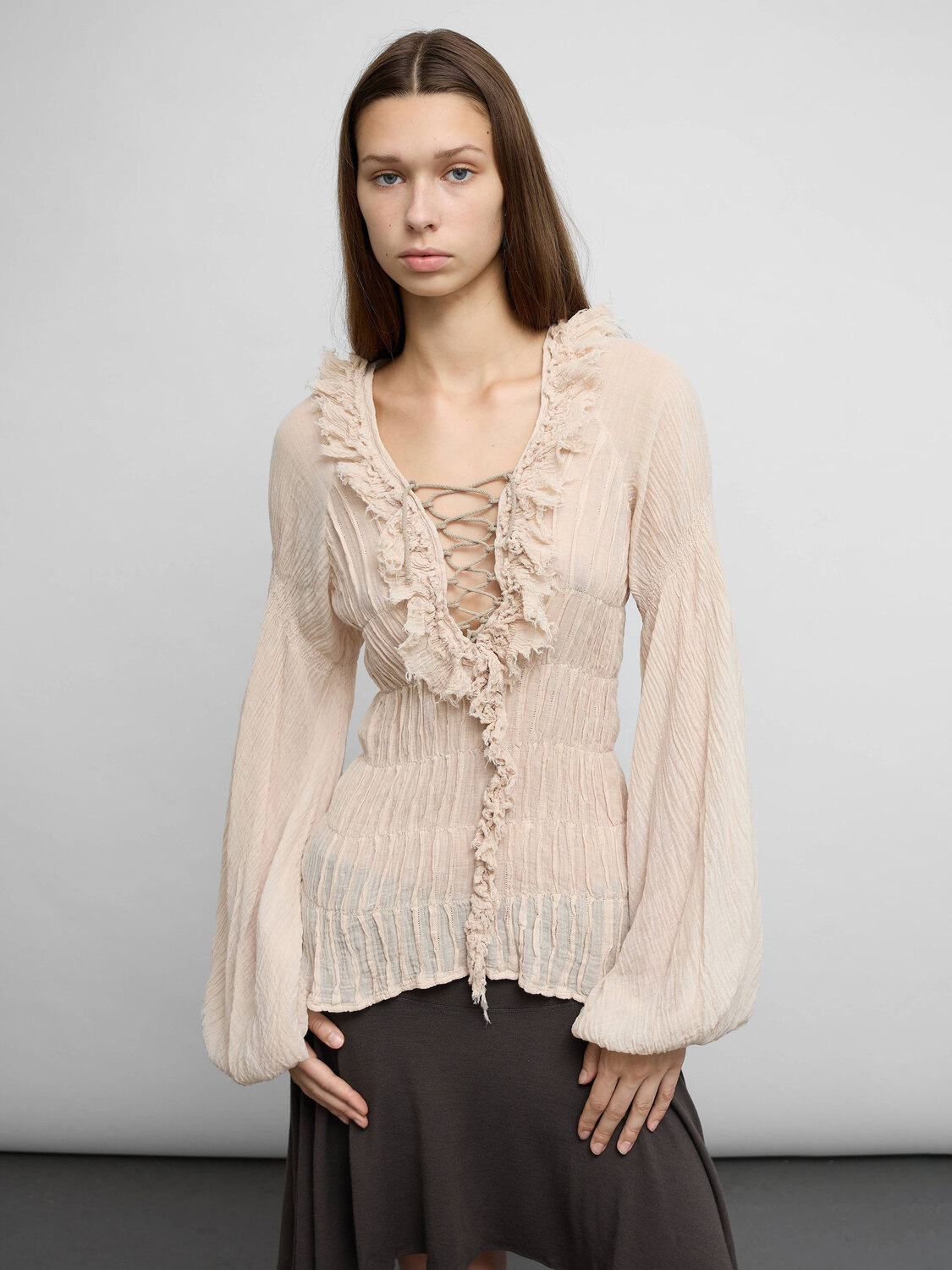 Michiko Koshino light peach gathered blouse with a lace-up detail and a ruffled trim.