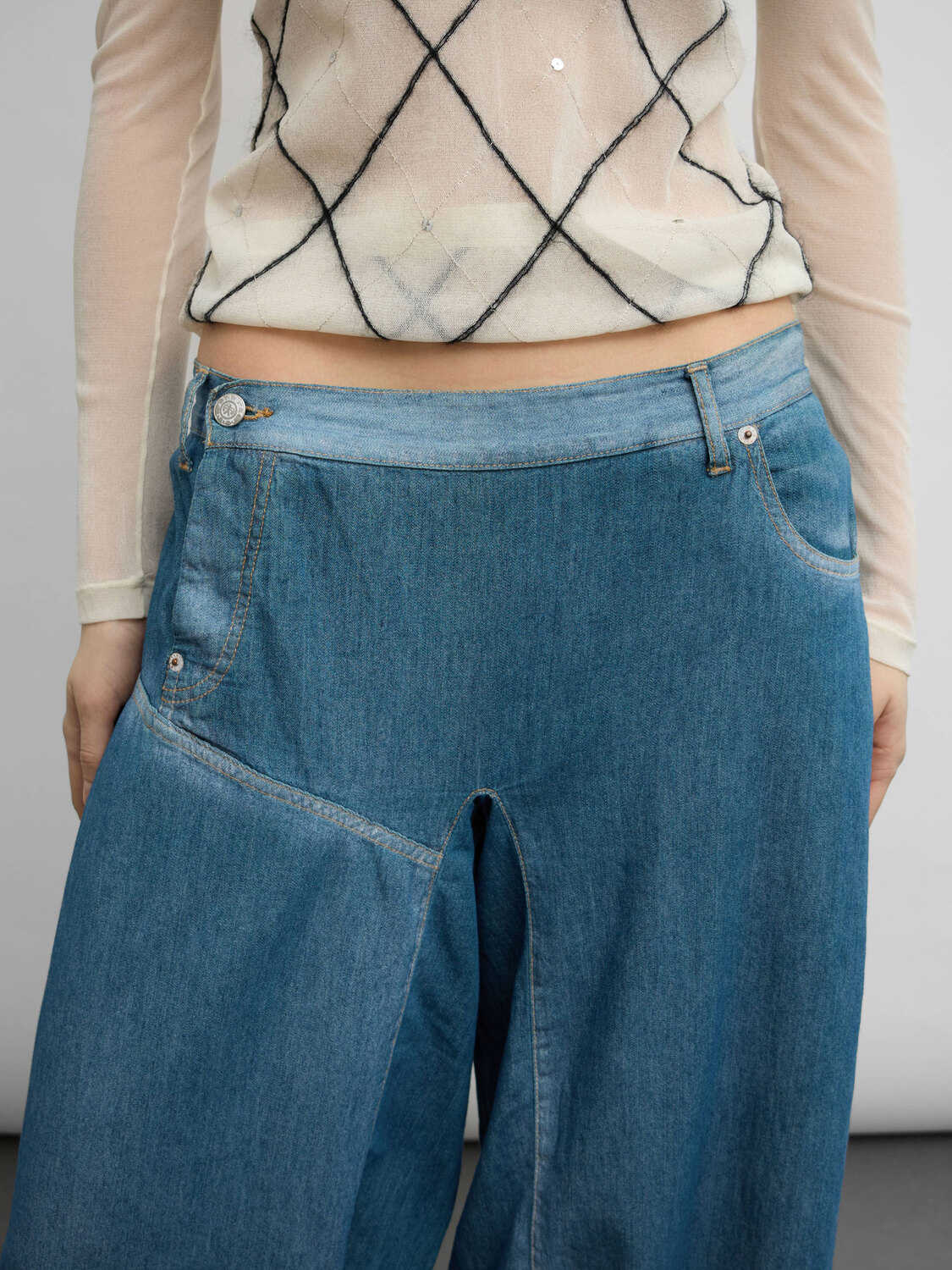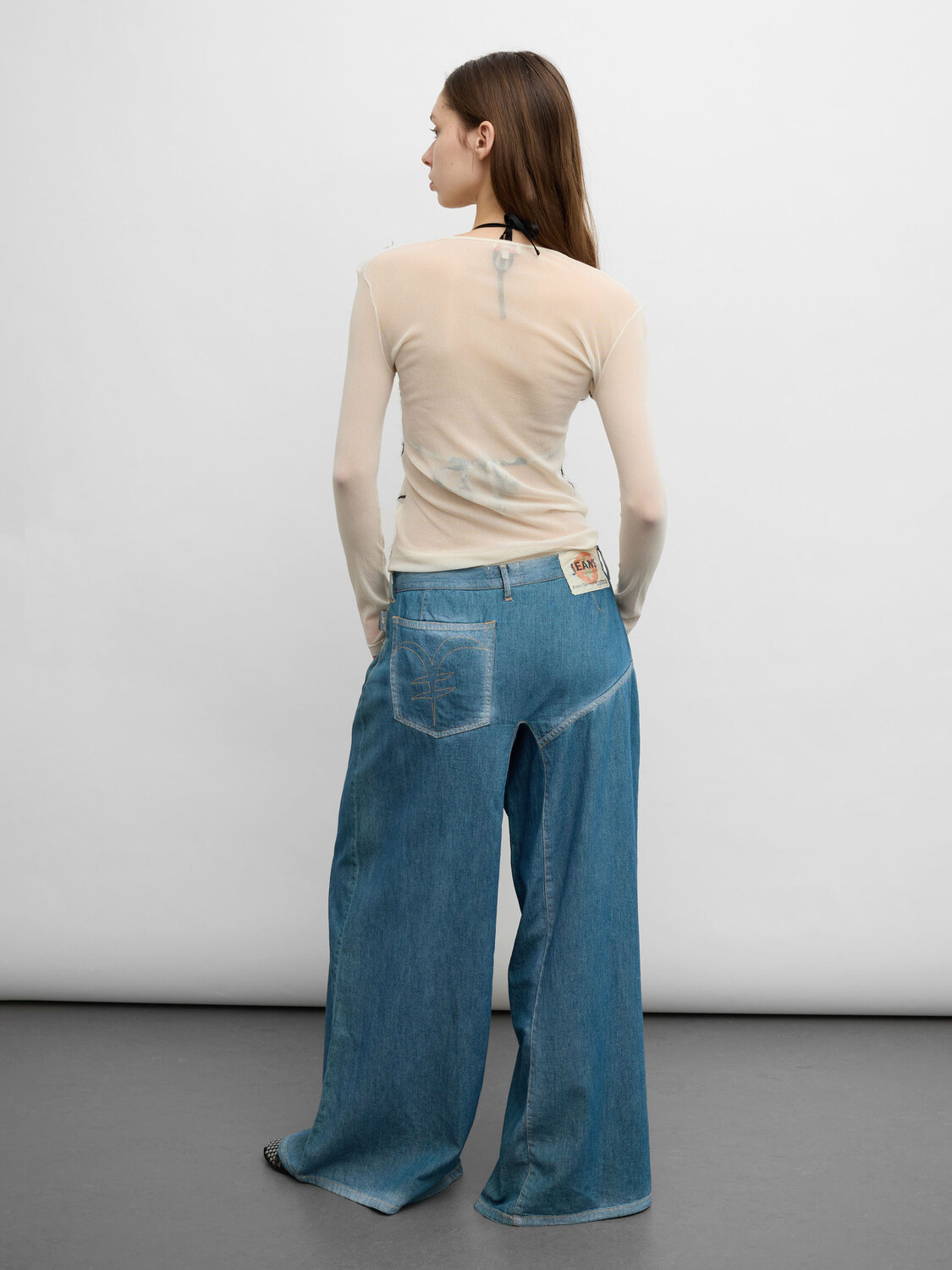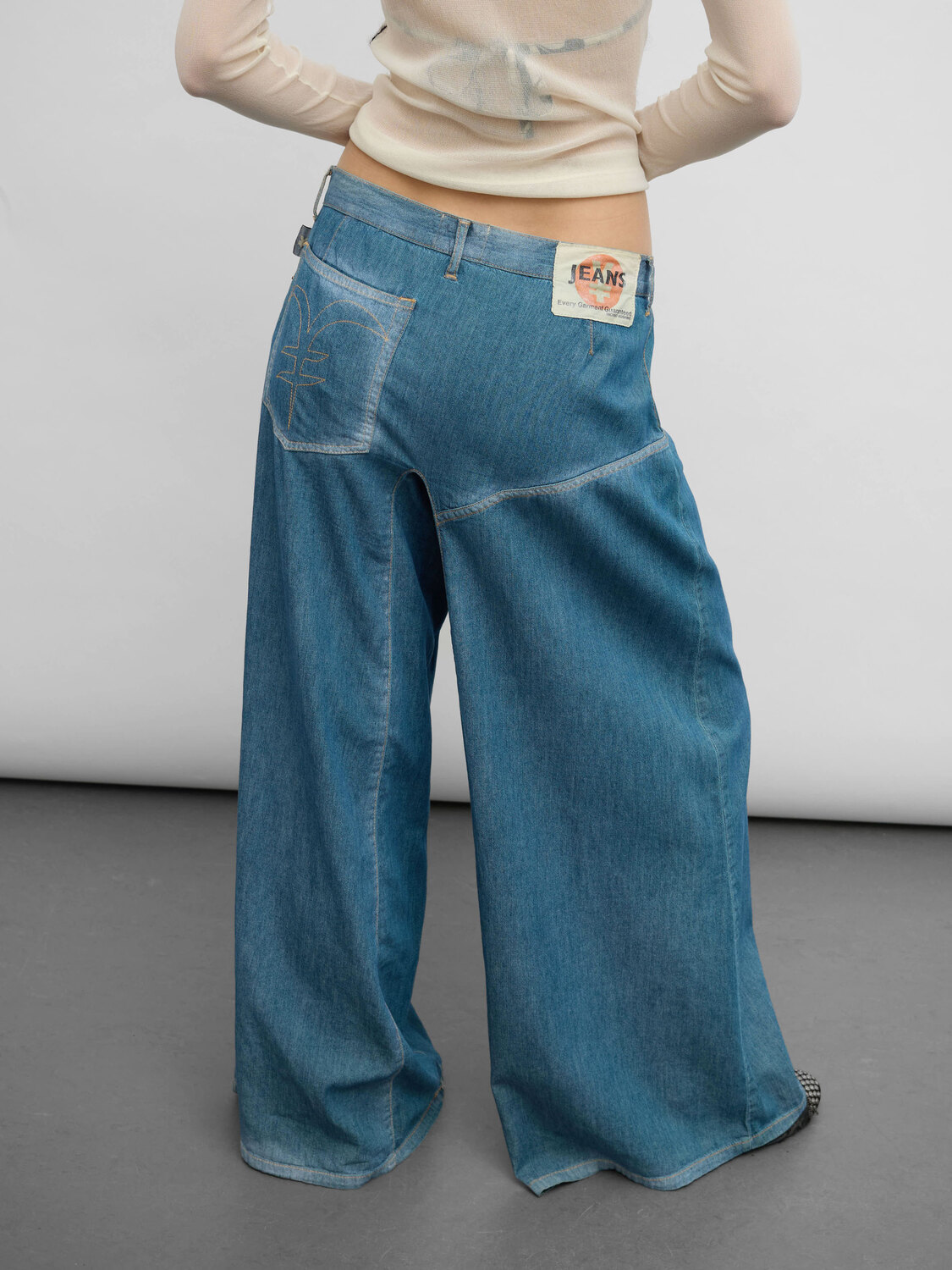 Michiko Koshino (Yen Jeans) blue wide-leg low-rise jeans. Logo embroidery on the rear pocket.