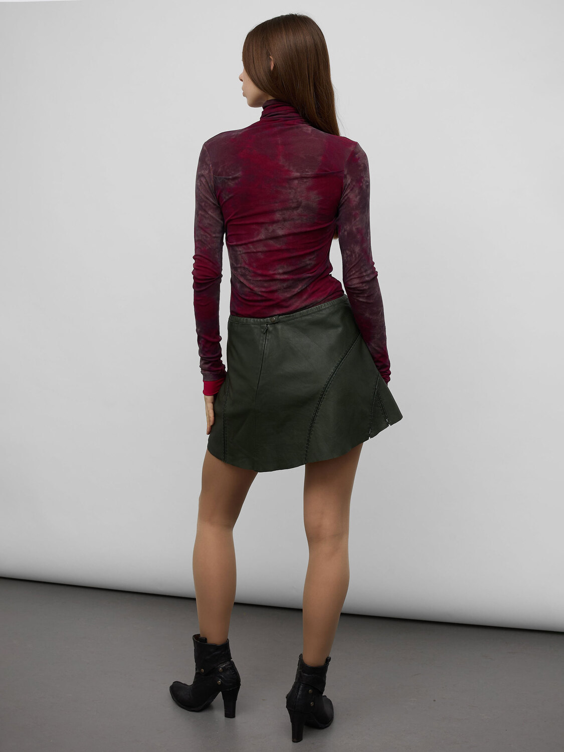 Michiko Koshino green leather deconstructed mini skirt with stitching and mesh details. Elasticated waist. Satin lining. Concealed zipper closure.