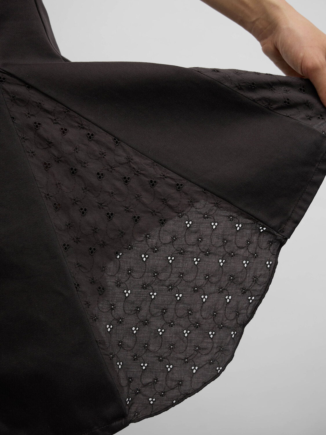 Michiko Koshino grey pleated asymmetrical midi skirt with decorative metal studs. Broderie anglaise details. Concealed zipper closure on the side.