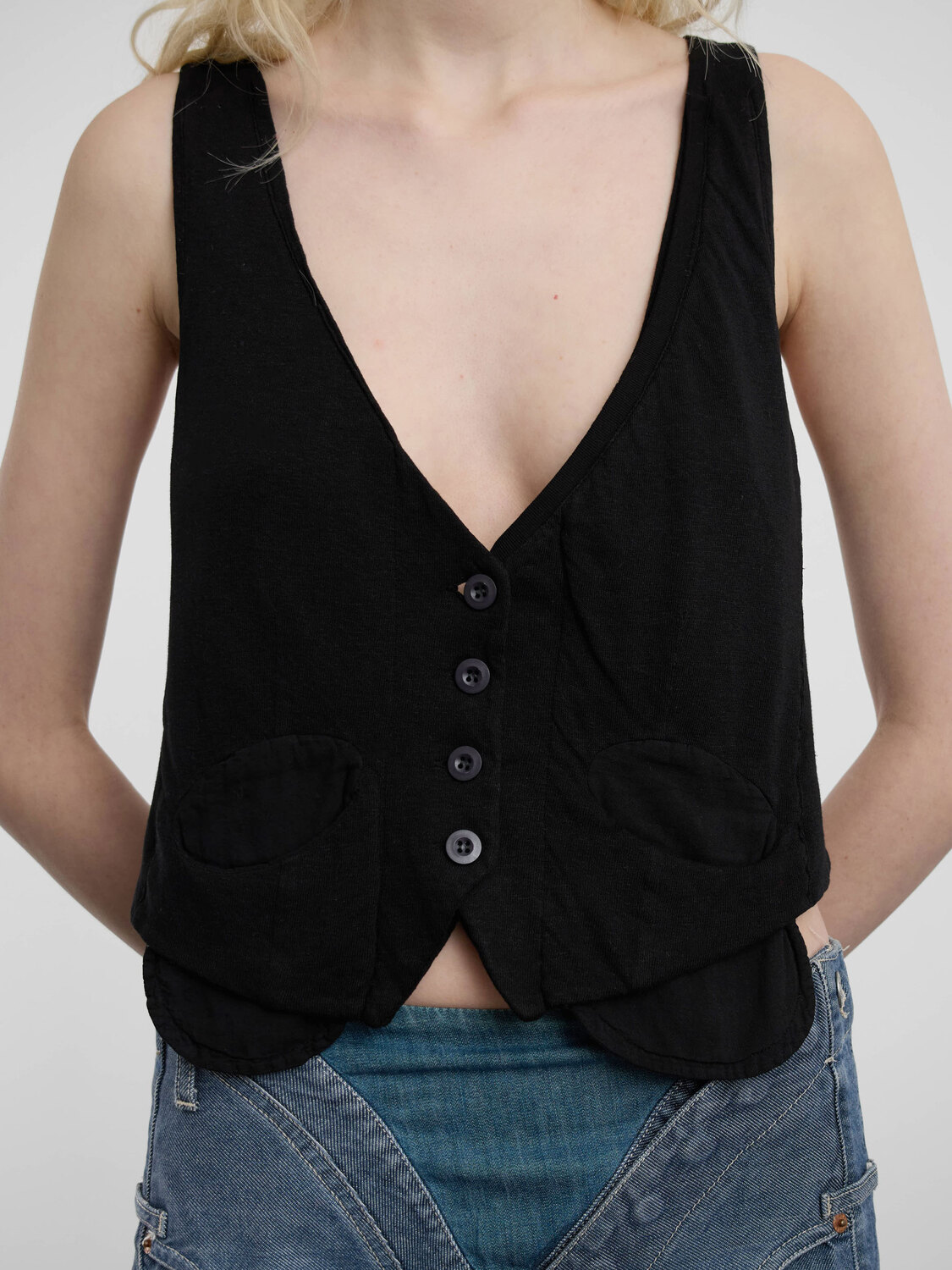 Michiko Koshino black deconstructed vest with button closure and adjustable waist.