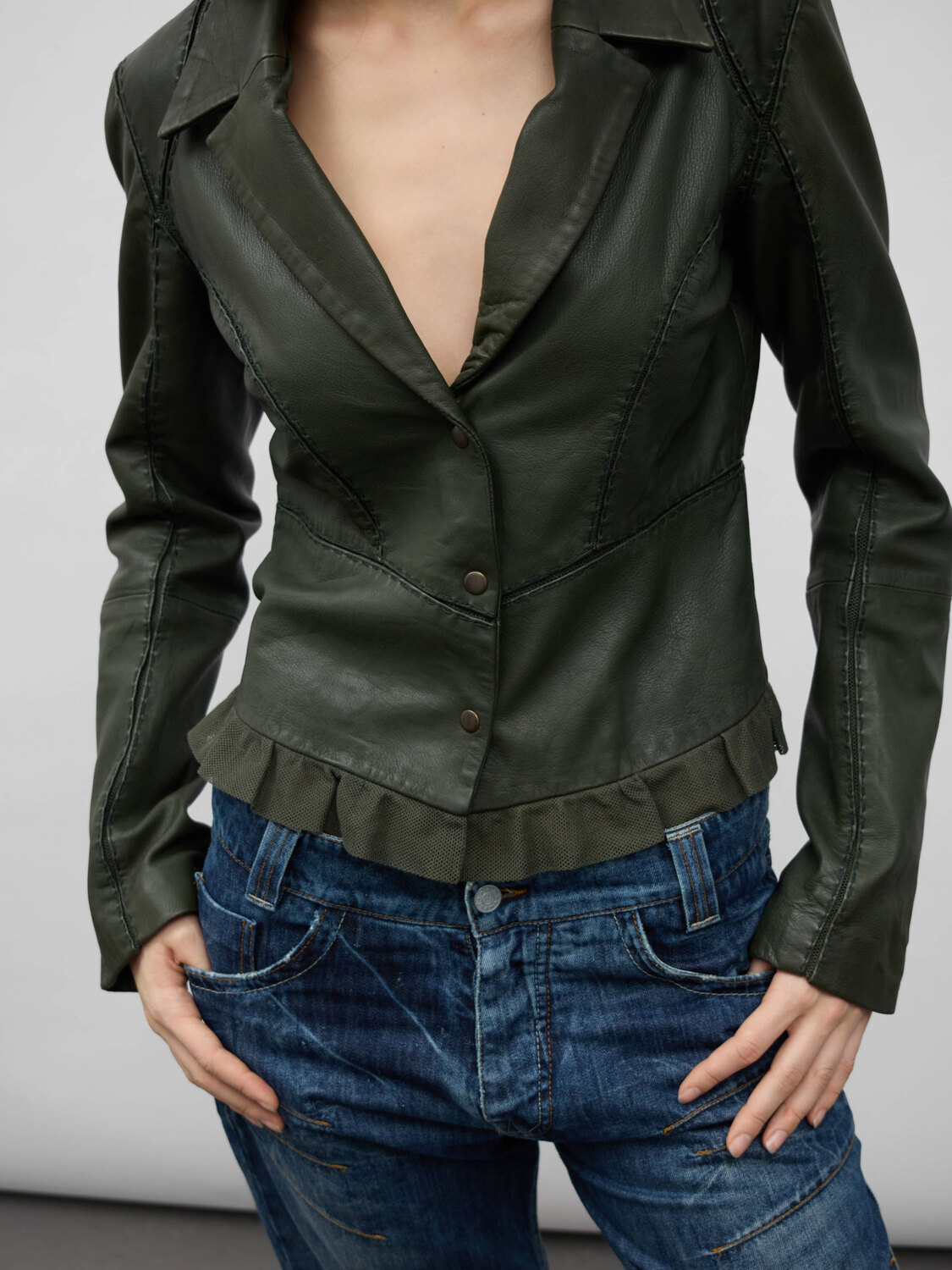 Michiko Koshino dark green leather deconstructed blazer jacket featuring snap button closure, decorative stitching details, thin sports mesh panels and mesh ruffled trim.