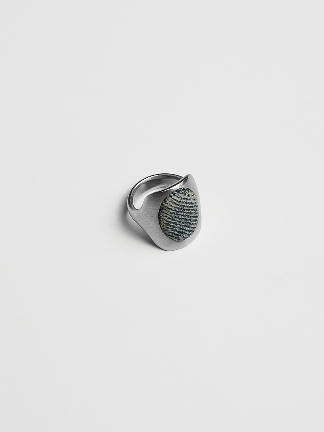 Miss Sixty brushed steel ring with a blue washed denim button.