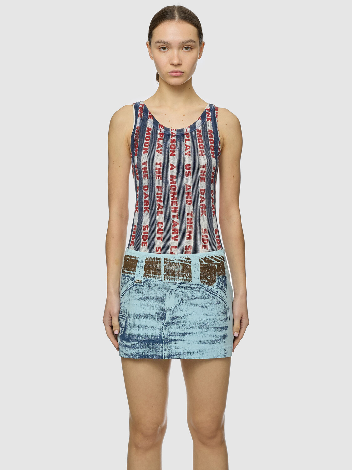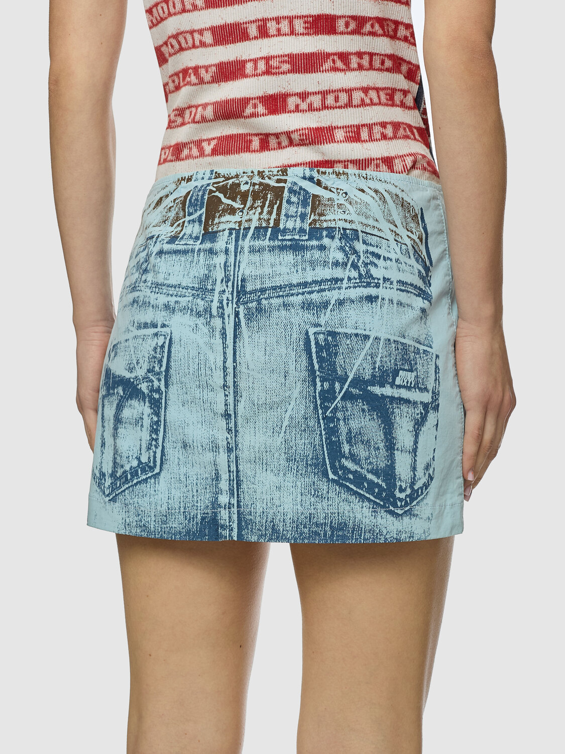 Miss Sixty light blue cotton mini skirt with denim mini skirt trompe l’oeil print.