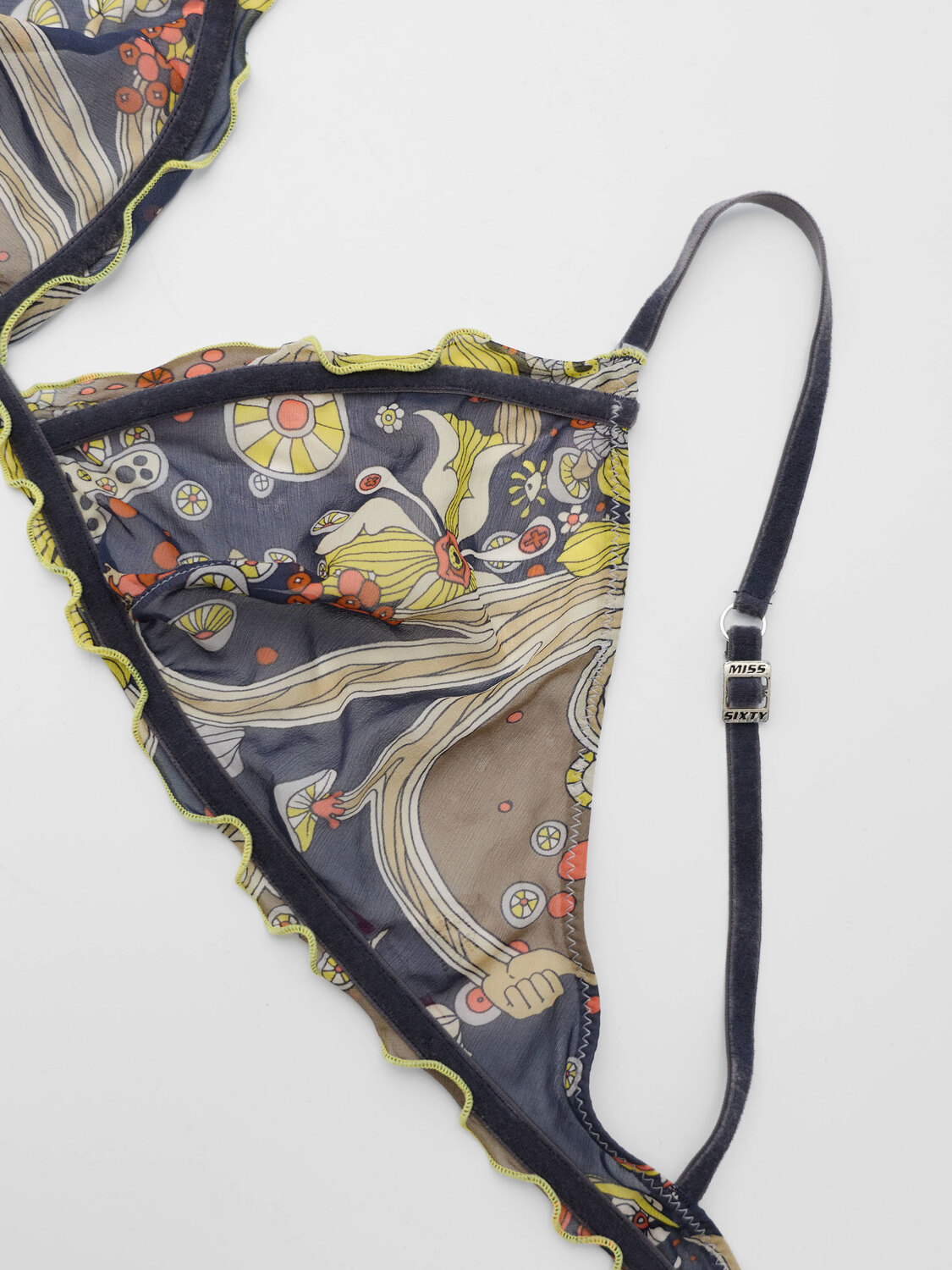 Miss Sixty triangle bra in navy blue sheer silk chiffon. Features a multicolour psychedelic mushroom print.