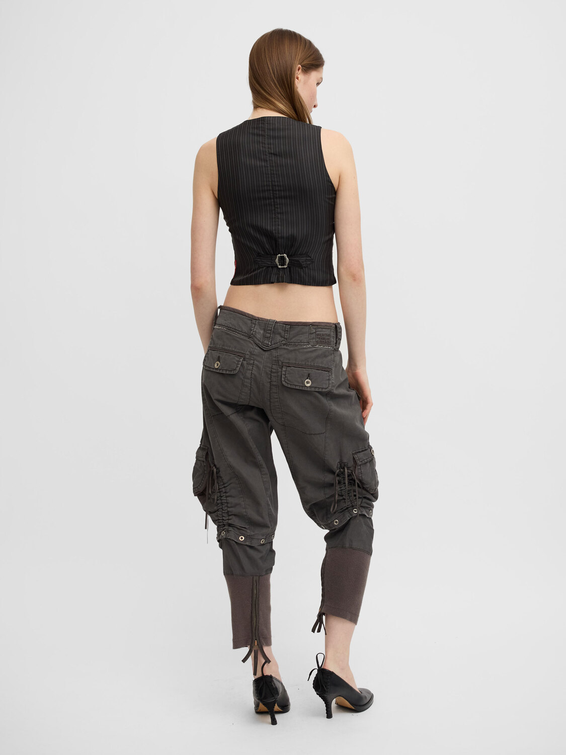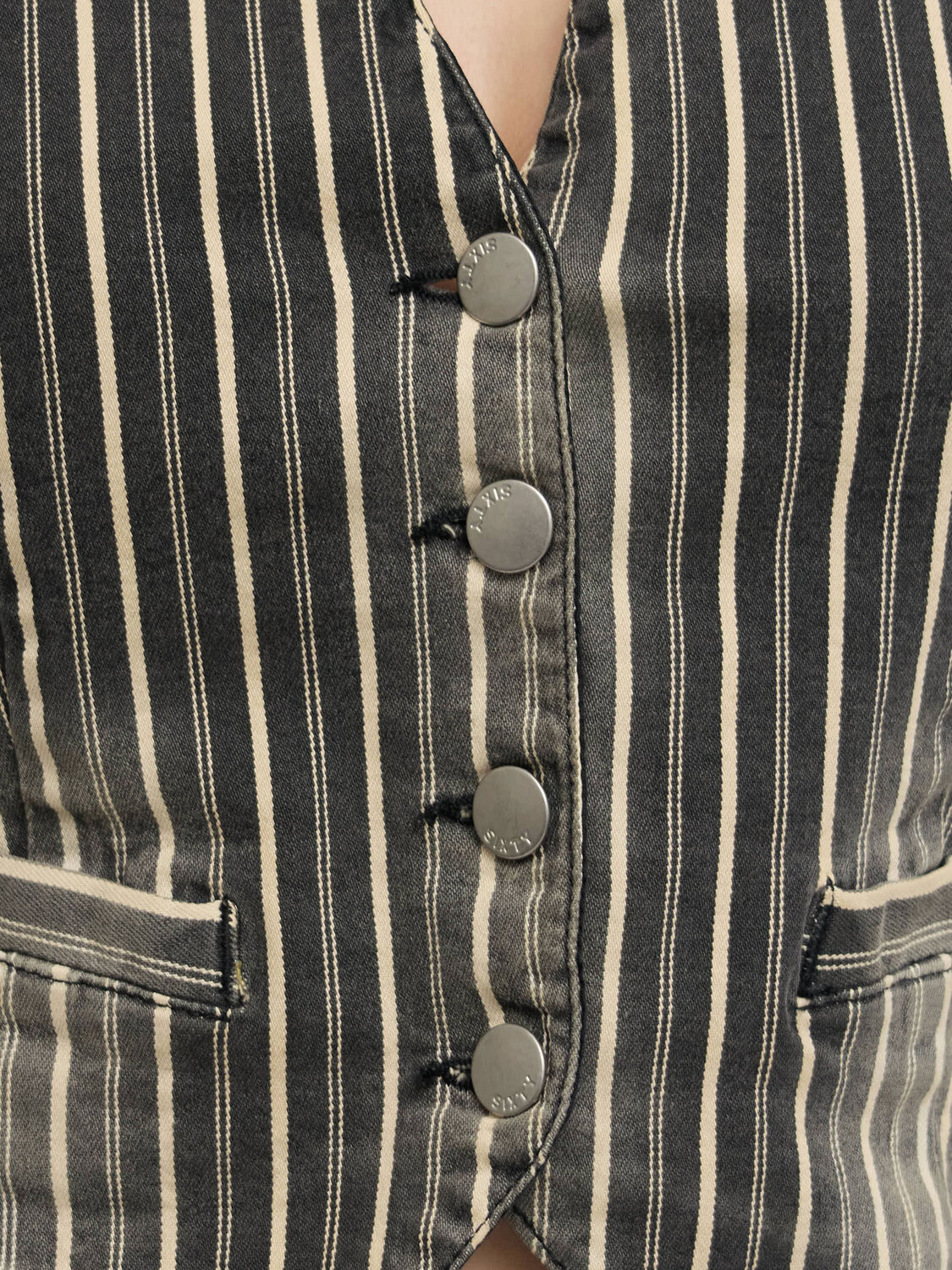 Miss Sixty striped black and white faded effect denim waistcoat with a satin rear panel. Button closure and faux welt pockets at the front. Adjustable strap at the back.