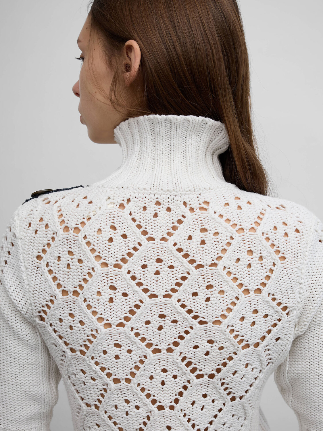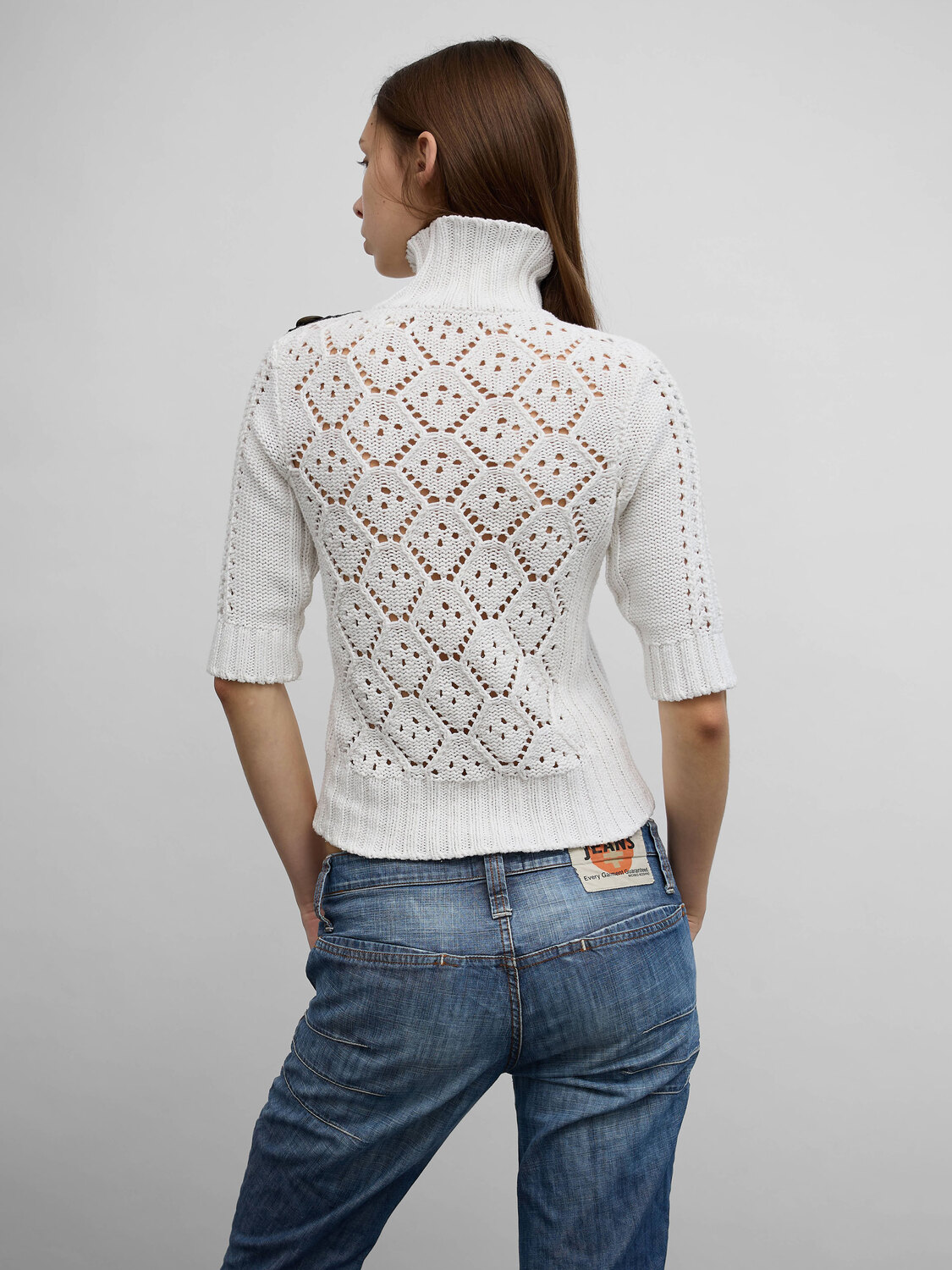 Miss Sixty white knitted short-sleeved zip-up cardigan with decorative denim strap at shoulder.