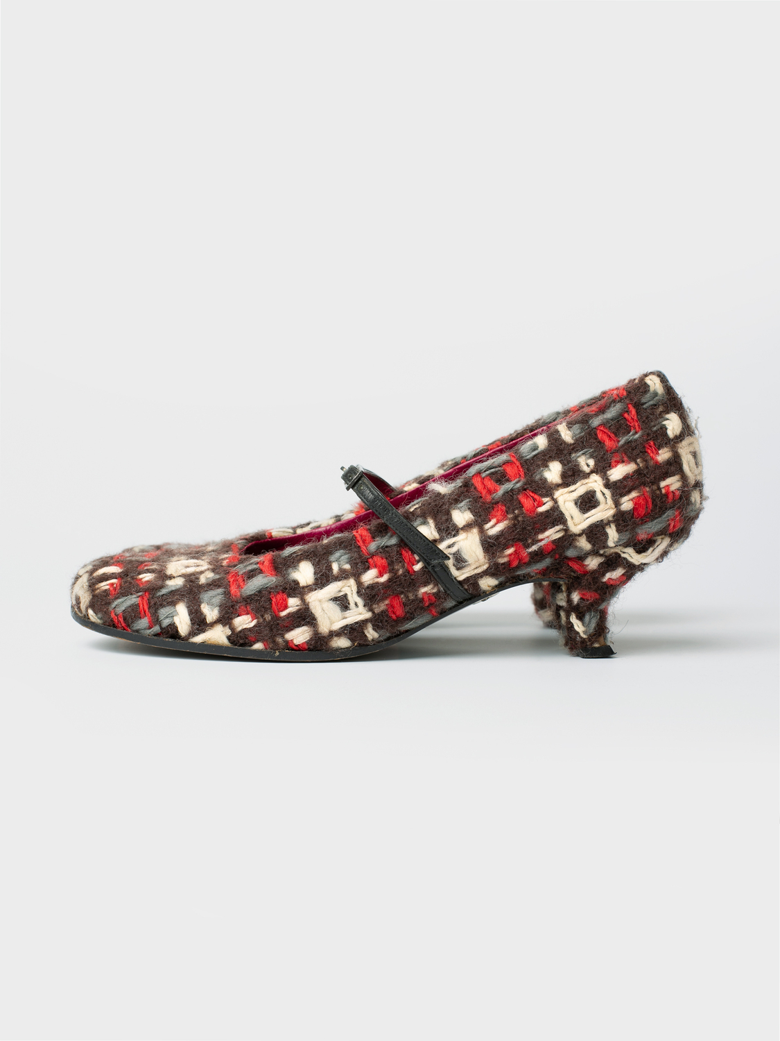 Muxart multicolour bouclé fabric heels with black leather straps and pink lining.
