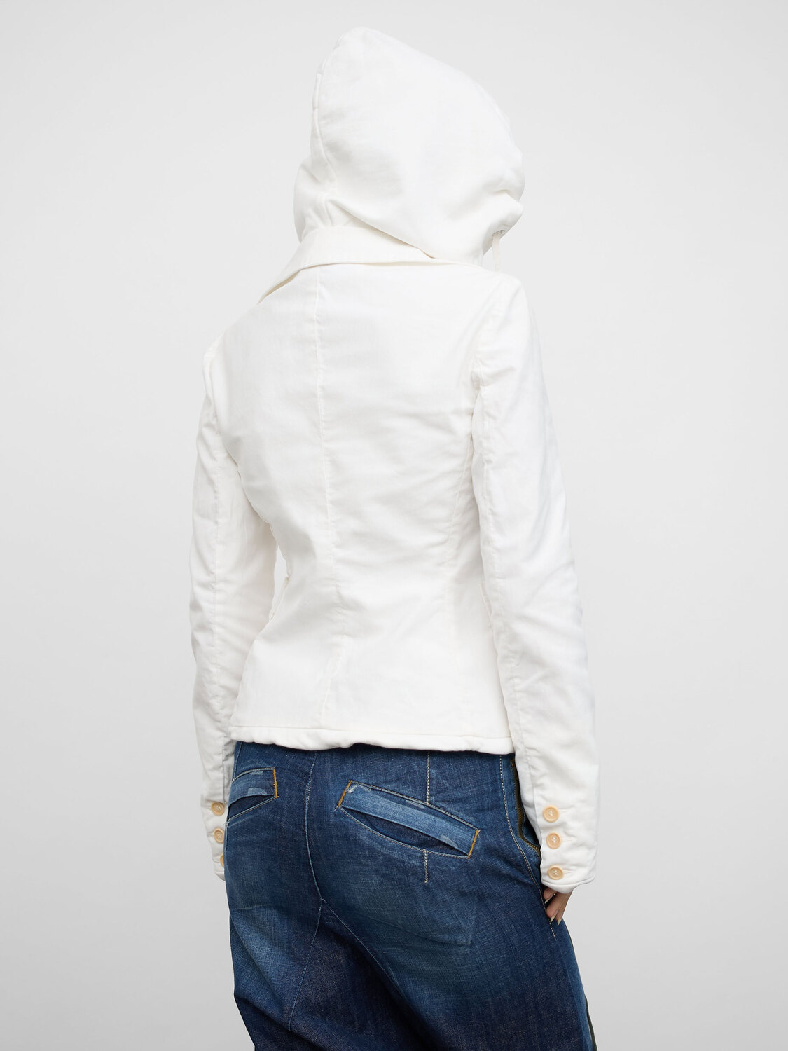 Nolita white cotton blazer with an integrated hoodie, pockets and clear glass buttons.