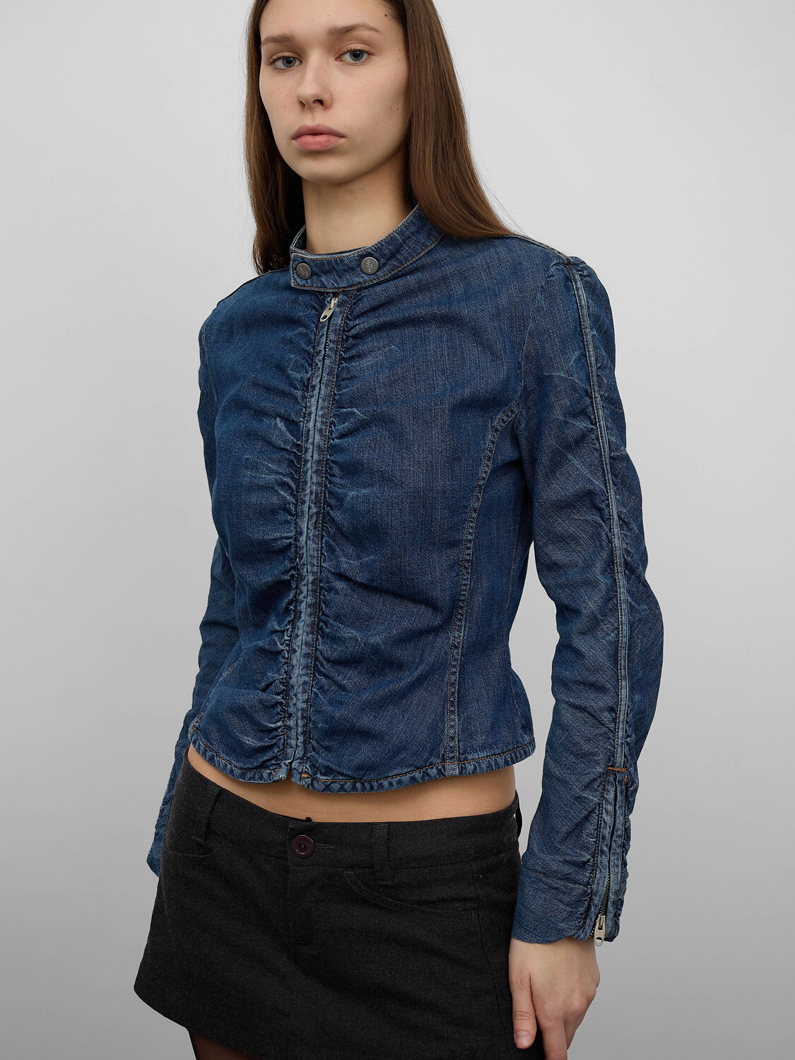 Nolita blue washed denim zip-up jacket with gathered details along the zipper and sleeves. Snap button collar.
