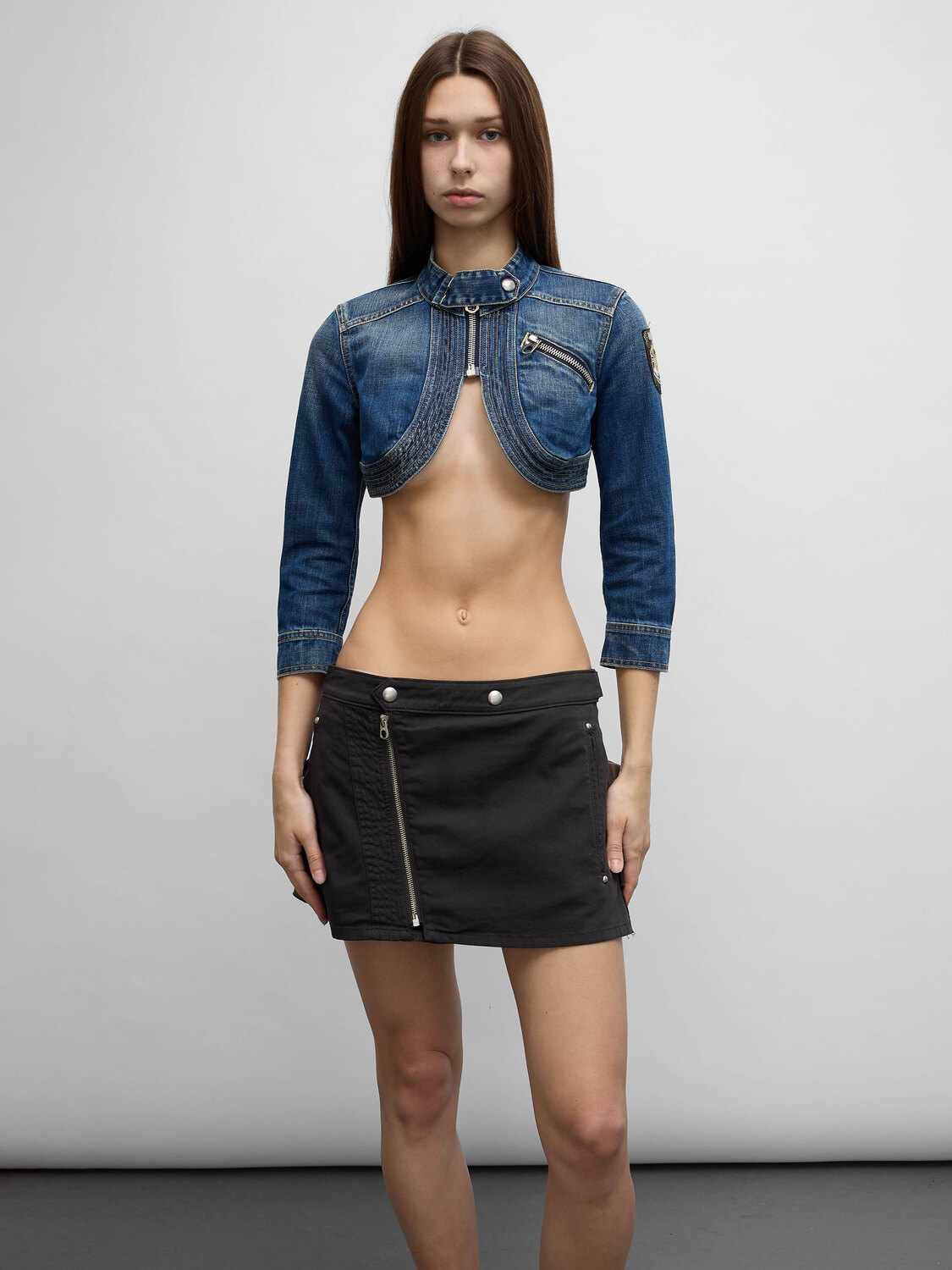 Nolita brown denim mini skirt featuring a zip and snap button closure, an integrated belt, and silk frill detail at the back.