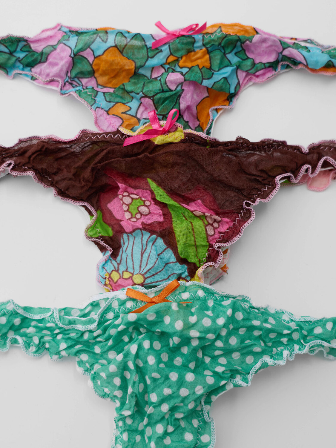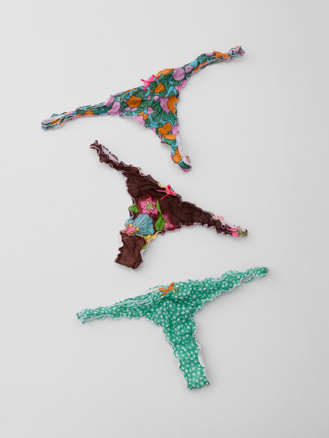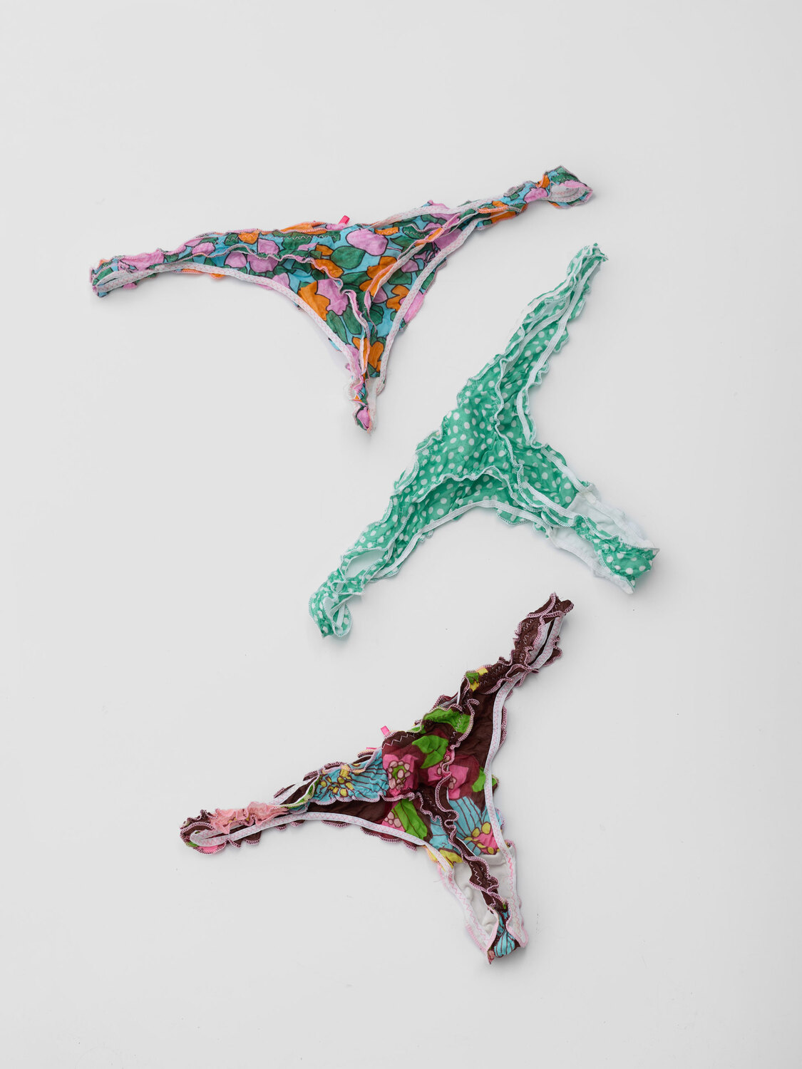 Nolita (Nolita Lace line) jar with three thong bottoms with floral and logo prints. Lettuce edges.