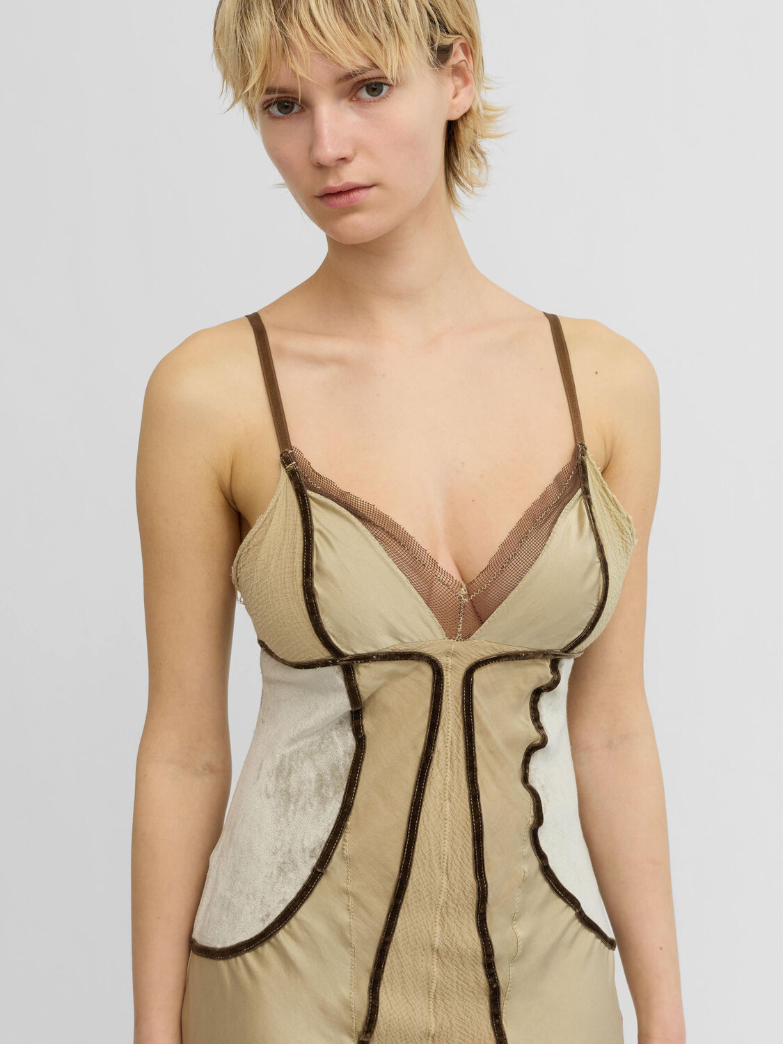 Nolita olive silk midi dress with brown velvet piping and grey plush sides.