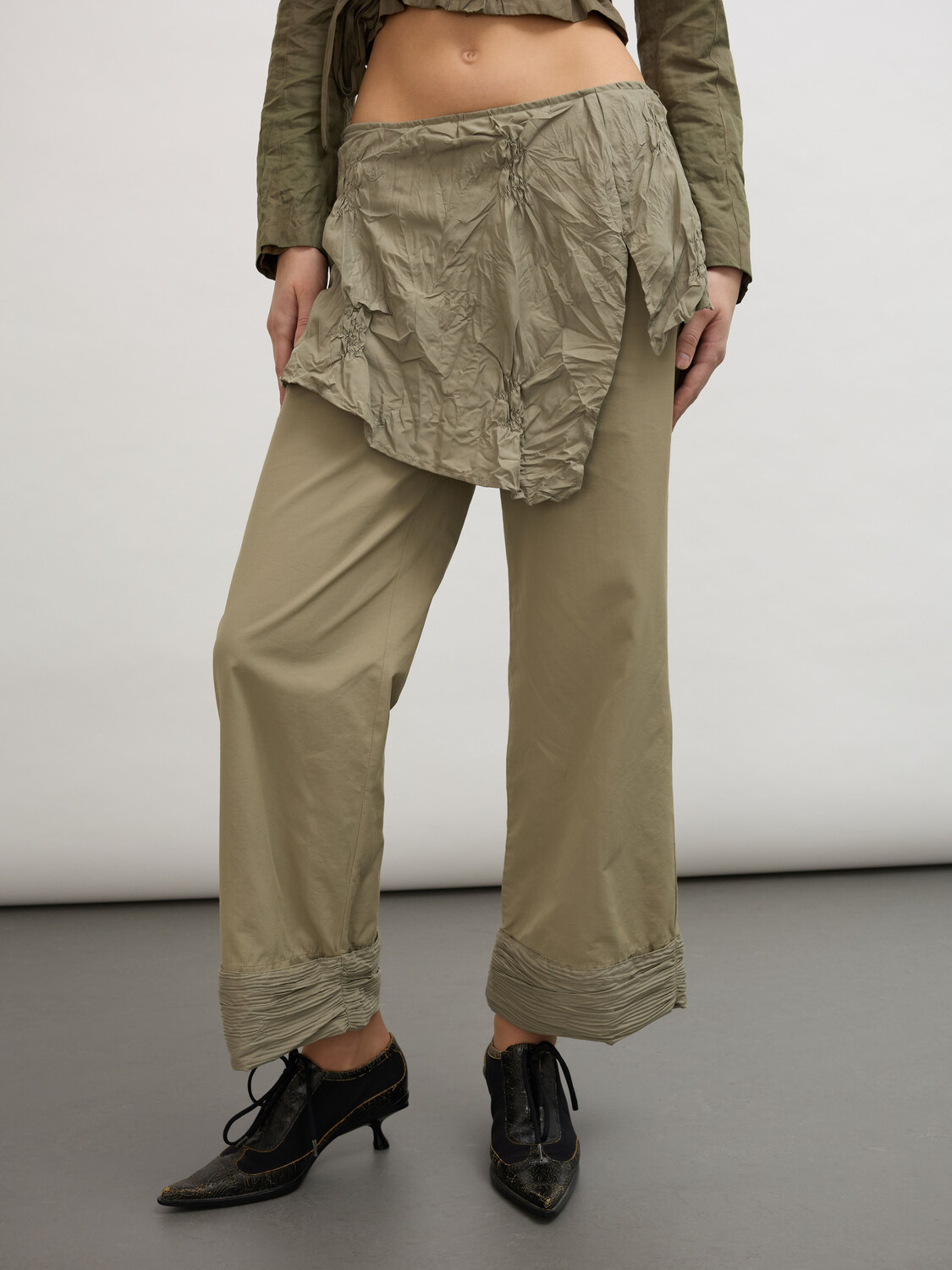 Olive green baggy low-rise trousers with an integrated wrinkled effect mini skirt.