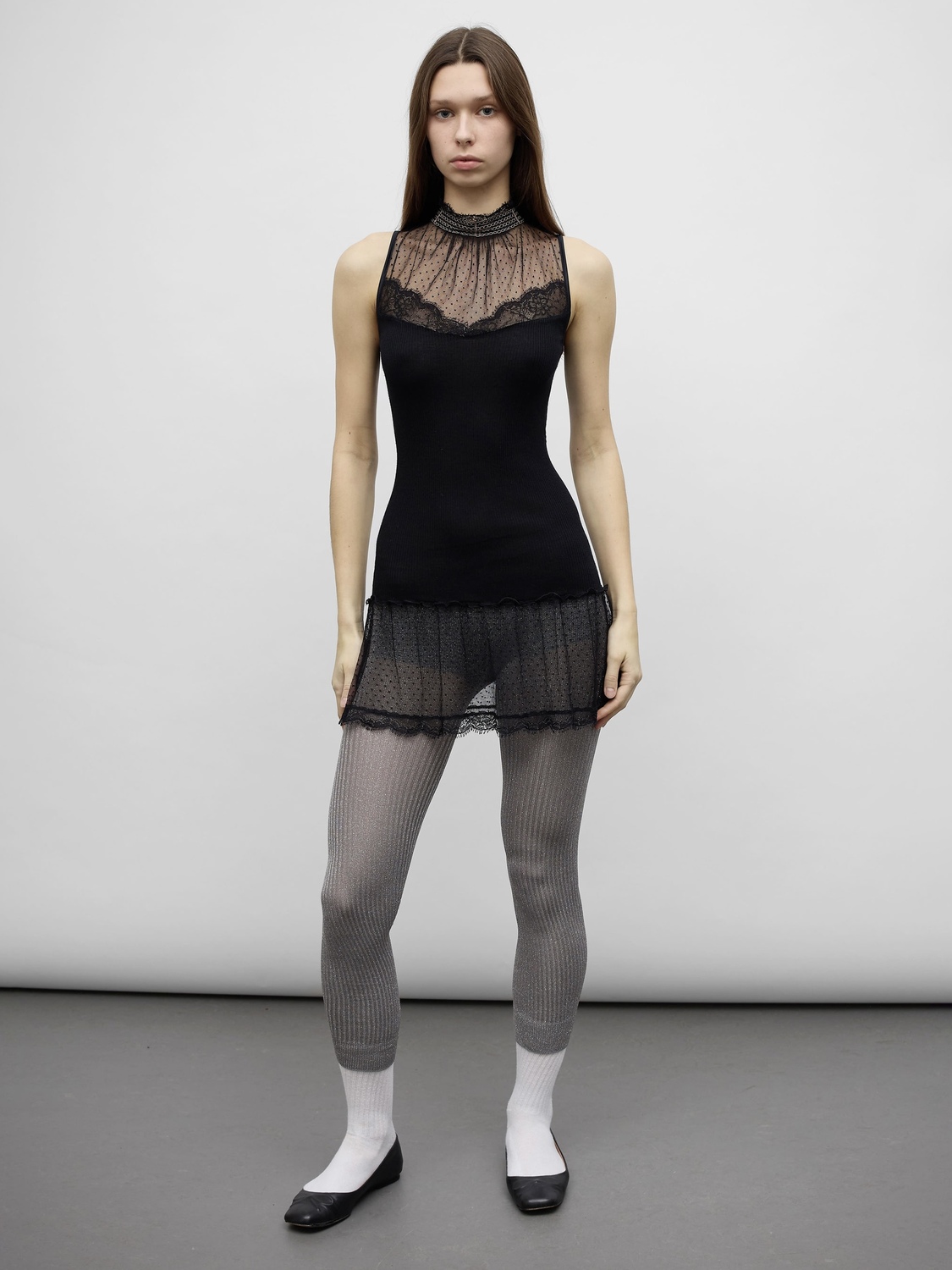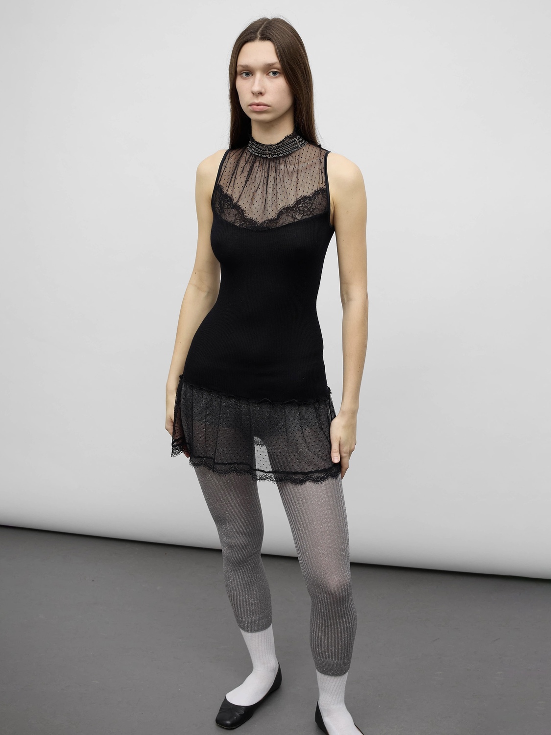 Oscalito black rib-knit and top with gathered polka-dot mesh bust and hem.