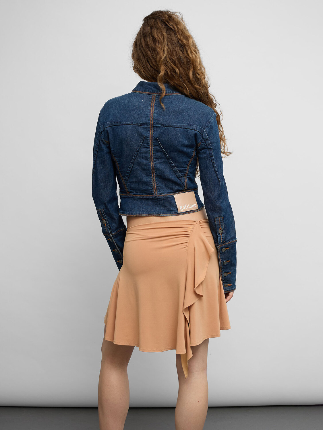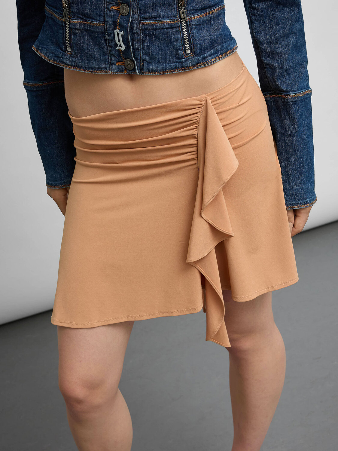 Plein Sud peach asymmetrical mini skirt with gathered details and flounces.