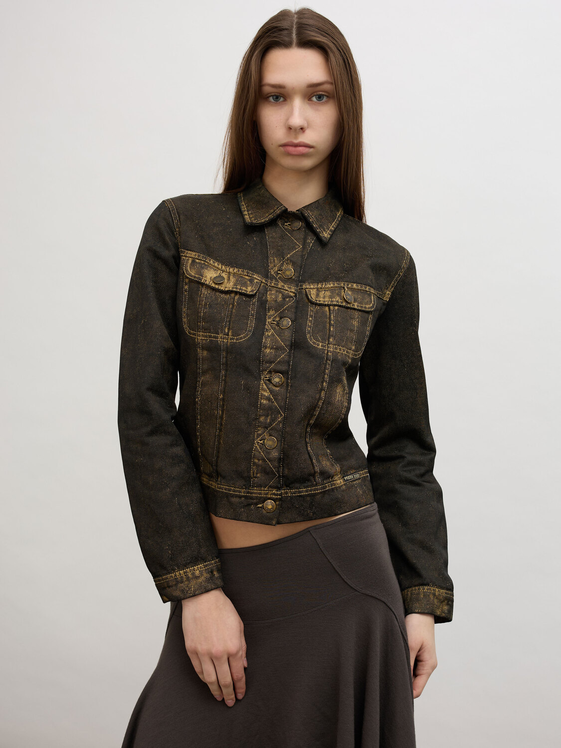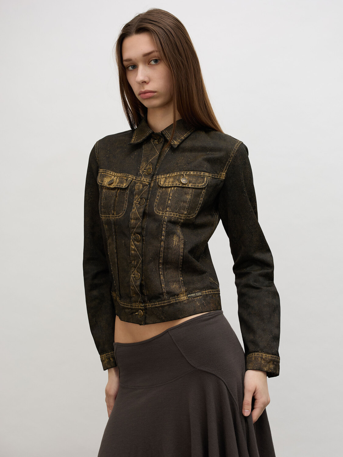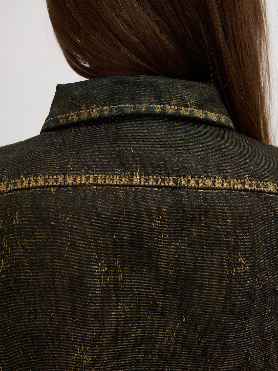 Plein Sud oxidized gold effect jacket featuring two chest pockets, two concealed waist pockets, and a button closure.