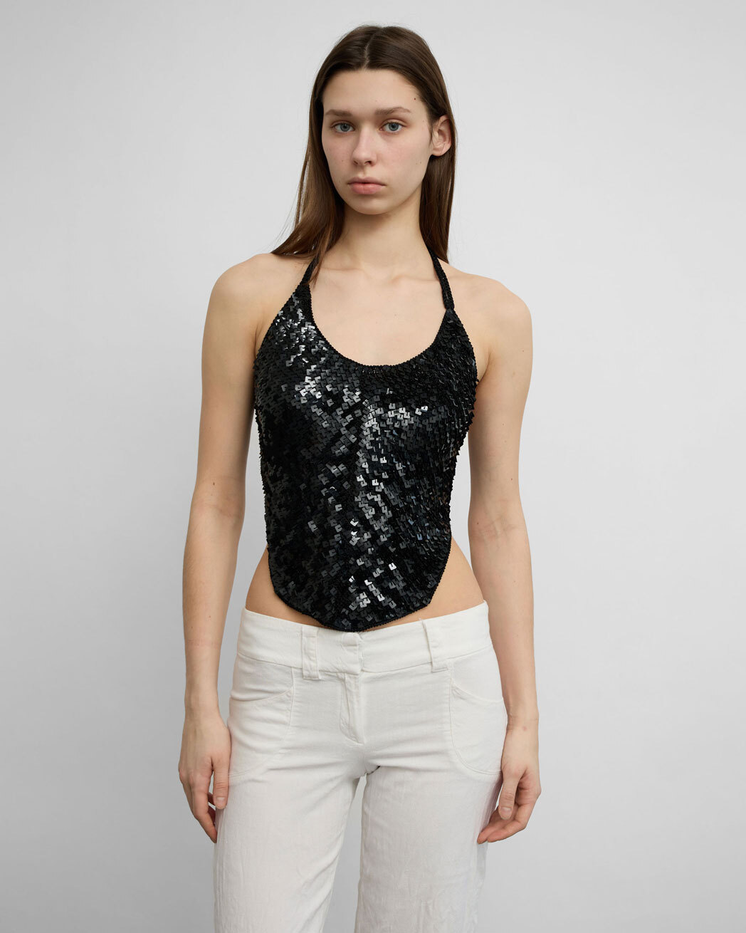Plein Sud black knitted halter top with square sequin embellishment. Ties at the back.
