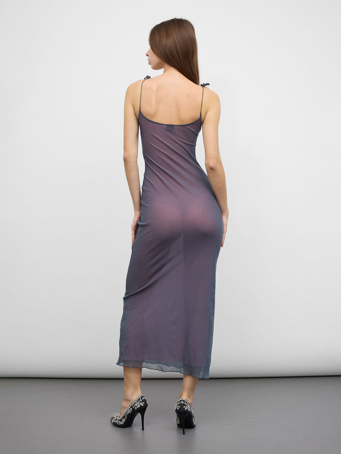 Plein Sud Jeans grey mesh camisole maxi dress with a gathered detail. Pink mesh lining. Adjustable spaghetti straps. Lettuce hem.
