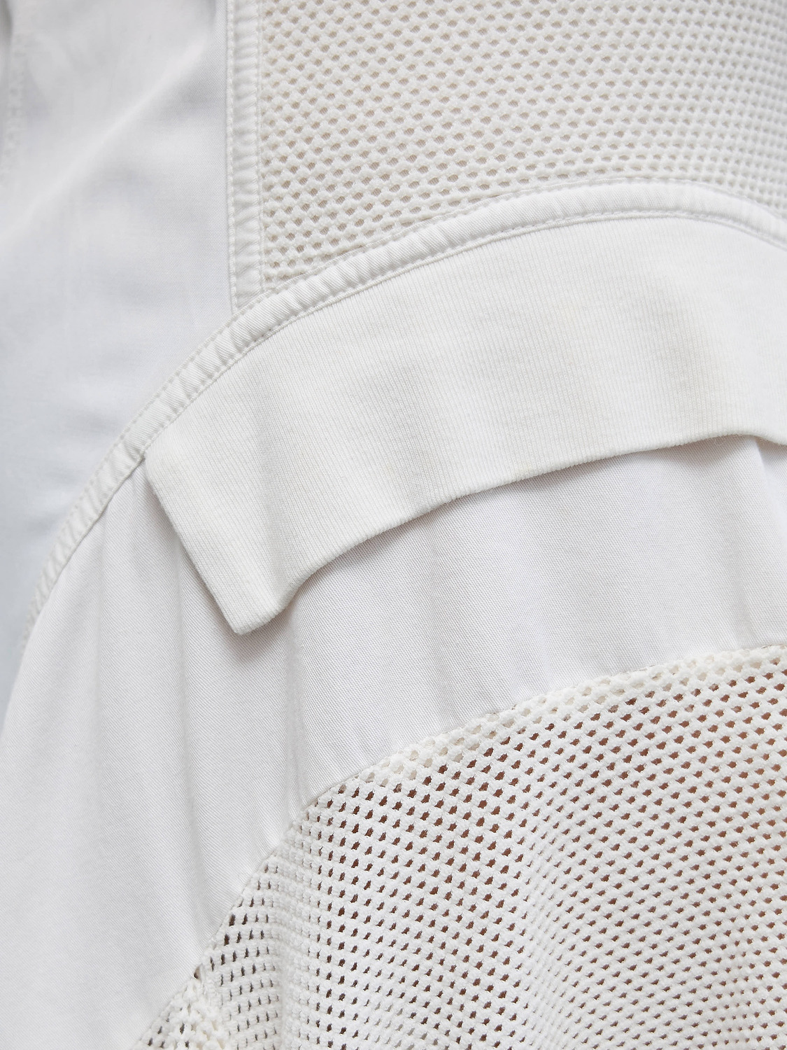 Plein Sud deconstructed dress in white satin, gabardine and nylon fishnet materials. Zip-up closure at the front. Adjustable straps.