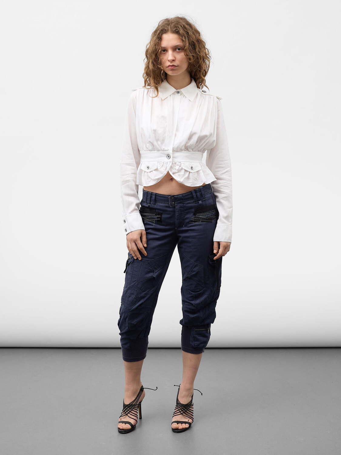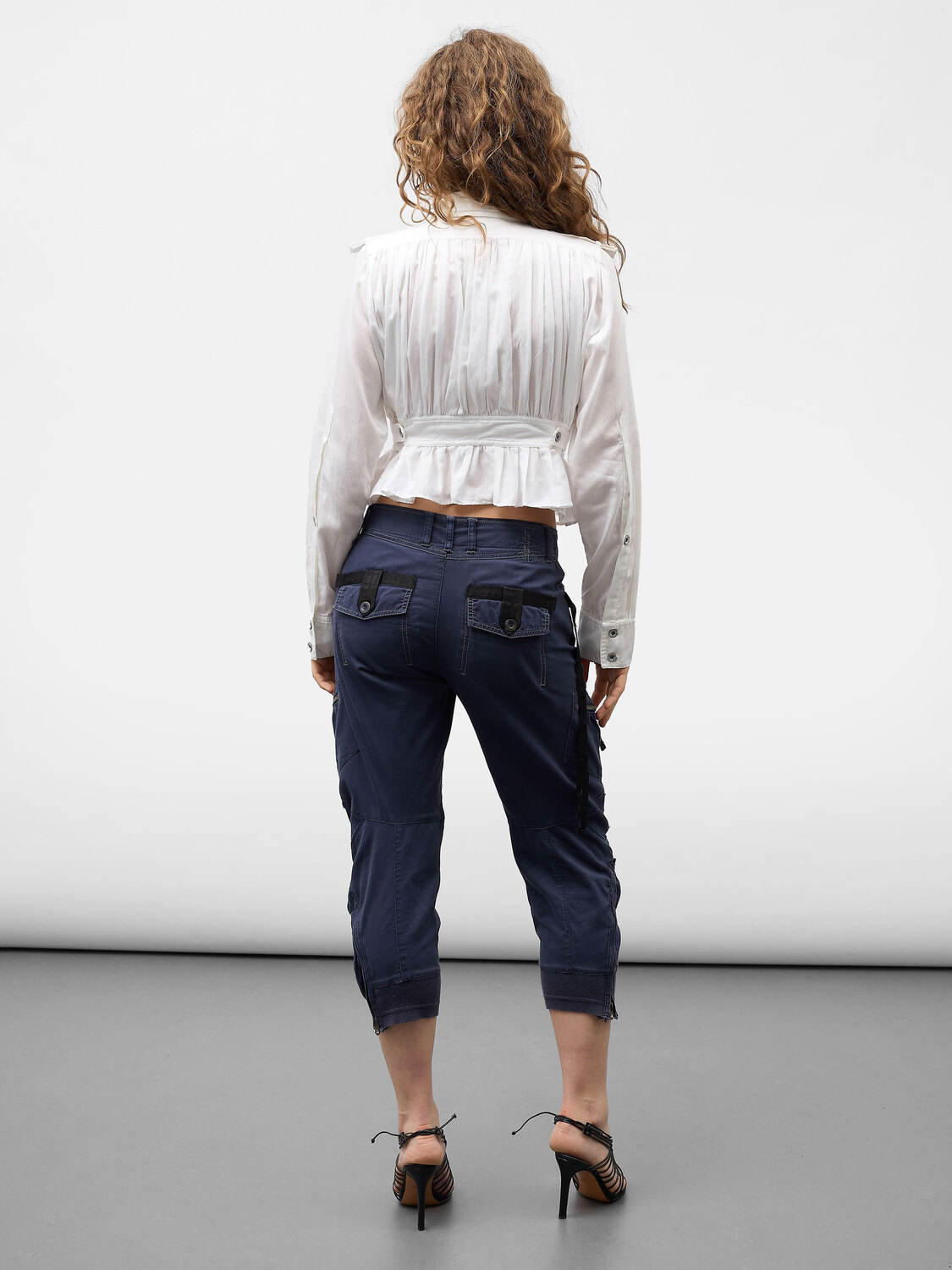Plein Sud Jeanius white cotton pleated blazer-style shirt with cutout details, faux pockets and shoulder straps.